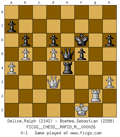 Last move : 0-1 2010 June 27 2:53:12 [Event "FICGS__CHESS__RAPID_M__000026"] [Site "FICGS"] [Date "2010.03.02"] [Round "1"] [White "Deline,Ralph"] [Black "Boehme,Sebastian"] [Result "0-1"] [WhiteElo "2142"] [BlackElo "2288"] 1.e4 c5 2.c3 Nf6 3.e5 Nd5 4.Nf3 Nc6 5.d4 cxd4 6.cxd4 d6 7.Bc4 Nb6 8.Bb3 dxe5 9.d5 Na5 10.Nc3 f6 11.Be3 g6 12.O-O Bg7 13.Rc1 Bf5 14.Nd2 O-O 15.a4 Nxb3 16.Qxb3 Nc8 17.f3 Nd6 18.Nde4 b6 19.Rfd1 Bd7 20.Nxd6 exd6 21.Ne4 Bf5 22.Rc6 Bxe4 23.fxe4 Rf7 24.Qb4 Bf8 25.Rf1 Qd7 26.Qc4 f5 27.h3 Re8 28.b4 Rb8 29.Kh2 h6 30.b5 Rb7 31.exf5 gxf5 32.g3 Rf6 33.Qc2 Qh7 34.Rc4 Qg6 35.Qc1 R6f7 36.Qc2 Kh7 37.Qe2 Rbe7 38.Qd3 e4 39.Qa3 Re5 40.Rd4 Bg7 41.Bf4 Re8 42.Rc4 Be5 43.Rg1 Rd7 44.Qe3 Bxf4 45.gxf4 Qf7 46.Qg3 e3 47.Rc2 e2 48.Re1 Rde7 49.Qg2 Qh5 50.Qg3 Kh8 51.Qd3 Re3 52.Qd4+ Kh7 53.Rc7+ R3e7 54.Rxe7+ Rxe7 55.Qd3 Re4 56.Qg3 Re8 57.Kh1 Re7 58.Qd3 Re4 59.Kg2 Qh4 60.Rxe2 Qxf4 61.Rf2 Qe5 62.Kf1 Kg6 63.Rg2+ Kf6 0-1 Sicilian : Alapin's variation (2.c3) Kingside Castling by player White (move 12) Kingside Castling by player Black (move 14) Player Black won this chess game. Follow this game move after move (download)Pawns: they are the soul of this game, they alone form the attack and defense. (Philidor) Ich suche im Schach immer etwas Eigenes. Riskantes Spiel im Stile schachlicher Musketiere ist nicht meine Sache, auch wenn es vielen Freunden scharfer Wendungen gefällt. (Anatoly Karpov) ¿Que sería del Ajedrez sin errores graciosos?. (Kurt Richter) Donnez-moi un Cavalier en 6e et je gagnerais toutes mes parties. (Steinitz) There are more things in heaven and earth than practically anywhere else. (Unknown)