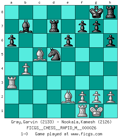 Last move : 1-0 2010 May 12 19:8:56 [Event "FICGS__CHESS__RAPID_M__000026"] [Site "FICGS"] [Date "2010.03.02"] [Round "1"] [White "Gray,Garvin"] [Black "Nookala,Kamesh"] [Result "1-0"] [WhiteElo "2133"] [BlackElo "2126"] 1.d4 d5 2.c4 c6 3.Nf3 Nf6 4.e3 e6 5.Nc3 Nbd7 6.Bd3 dxc4 7.Bxc4 b5 8.Bd3 Bb7 9.e4 b4 10.Na4 c5 11.e5 Nd5 12.Nxc5 Nxc5 13.dxc5 Bxc5 14.O-O h6 15.Nd2 Qc7 16.Ne4 Be7 17.Bb5+ Kf8 18.Qd4 a6 19.Bc4 Rd8 20.Nd6 Bxd6 21.exd6 Qxd6 22.a3 Nb6 23.Qxd6+ Rxd6 24.Be2 bxa3 25.b4 Kg8 26.Be3 Nd5 27.Bc5 Rd7 28.Rxa3 1-0 QGD Slav : 4.e3 Kingside Castling by player White (move 14) Player White won this chess game. Follow this game move after move (download)Good positions don't win games, good moves do. (Gerald Abrahams) Ein guter Spieler hat immer Glück. (José Raúl Capablanca) La táctica fluye a partir de una posición superior. (Bobby Fischer) Toute estimation doit être constamment réévaluée. (Jacob Estrin) Inventor: A person who makes an ingenious arrangement of wheels, levers and springs, and believes it civilization. (Ambrose Bierce, The Devil's Dictionary)