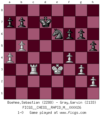 Last move : 1-0 2010 July 20 5:1:59 [Event "FICGS__CHESS__RAPID_M__000026"] [Site "FICGS"] [Date "2010.03.02"] [Round "1"] [White "Boehme,Sebastian"] [Black "Gray,Garvin"] [Result "1-0"] [WhiteElo "2288"] [BlackElo "2133"] 1.e4 e5 2.Nf3 Nf6 3.Nxe5 d6 4.Nf3 Nxe4 5.d4 d5 6.Bd3 Nc6 7.O-O Be7 8.c4 Nb4 9.Be2 O-O 10.Nc3 Be6 11.Ne5 f6 12.Nf3 c5 13.Be3 Rc8 14.dxc5 Bxc5 15.Bxc5 Rxc5 16.Qb3 Nxc3 17.Qxc3 Nc6 18.b4 Rxc4 19.Bxc4 dxc4 20.b5 Ne7 21.Rfe1 Bf7 22.Rad1 Qc7 23.Nd4 Nd5 24.Qf3 Rd8 25.Ne6 Bxe6 26.Rxe6 Qc5 27.Re4 c3 28.Qd3 Kf7 29.Rd4 Nf4 30.Rd7+ Rxd7 31.Qxd7+ Qe7 32.Kf1 h5 33.Qxe7+ Kxe7 34.g3 Ne6 35.Rc1 Kd6 36.Rxc3 Nc7 37.a4 g6 38.Ke2 Kd7 39.Rd3+ Ke7 40.Ke3 Ne6 41.Rc3 Kd7 42.f4 1-0 Petrov : Classical attack Kingside Castling by player White (move 7) Kingside Castling by player Black (move 9) Player White won this chess game. Follow this game move after move (download)The tactician must know what to do whenever something needs doing; the strategist must know what to do when nothing needs doing. (Savielly Tartakover) Du musst nicht gut spielen, es reicht, wenn du besser spielst als dein Gegner. (Anonymous) Todos los Maestros de Ajedrez fueron un día unos principiantes. (Chernev) Les Echecs ne sont pas pour les âmes timides. Ils requièrent un homme entier, qui ne s'arrête pas aveuglément à ce qui a été déjà établi, mais qui tente individuellement de sonder les profondeurs du jeu. (W. Steinitz) Thibault, I ask for draw. Game 13876. - Sorry Ilmars, you won. (FICGS chat)