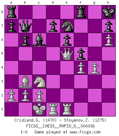 Last move : 1-0 2010 March 17 21:50:20 [Event "FICGS__CHESS__RAPID_D__000036"] [Site "FICGS"] [Date "2010.03.02"] [Round "1"] [White "Cridland,Graham"] [Black "Stoyanov,Zdravko"] [Result "1-0"] [WhiteElo "1470"] [BlackElo "1275"] 1.e4 c5 2.Nf3 Nc6 3.d4 cxd4 4.Nxd4 Nxd4 5.Qxd4 e6 6.Nc3 b6 7.Be3 f6 8.O-O-O Bc5 9.Qd2 Ne7 10.Bc4 O-O 11.h4 Bb7 12.h5 Bxe3 13.Qxe3 Qc8 14.Bb3 Kh8 15.h6 g6 16.f4 Bc6 17.g4 Qb7 18.Rhe1 f5 19.exf5 gxf5 20.Qe5+ 1-0 Sicilian defense Queenside Castling by player White (move 8) Kingside Castling by player Black (move 10) Player White won this chess game. Follow this game move after move (download)It's always better to sacrifice your opponent's men. (Savielly Tartakover) Später, ... hatte ich zunehmend Erfolg in entscheidenden Partien. Vielleicht weil ich eine einfache Wahrheit erkannte: nicht nur ich hatte Angst, auch mein Gegner. (Mikhail Nekhemyevich Tal) El Ajedrez es tortura mental. (Garry Kasparov) Si le désir cupide (et stupide) de gagner est une inépuisable source de souffrance, une combinaison brillante sur l'échiquier est une découverte : le coquelicot qui s'épanouit lorsque apparaît la Voie Lactée. (Arrabal) I've lost money so fast in these clubs it's left me reeling. I've read every poker book ever written, but the only way to get better at the game is to go out and play with people who are really good. The problem is, you stand to lose a lot of money doing it. (Matt Damon)