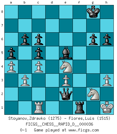 Last move : 0-1 2010 March 9 11:39:47 [Event "FICGS__CHESS__RAPID_D__000036"] [Site "FICGS"] [Date "2010.03.02"] [Round "1"] [White "Stoyanov,Zdravko"] [Black "Flores,Luis"] [Result "0-1"] [WhiteElo "1275"] [BlackElo "1515"] 1.e4 c5 2.Nf3 Nc6 3.Bb5 g6 4.Bxc6 dxc6 5.h3 Bg7 6.O-O e5 7.a3 Ne7 8.Re1 O-O 9.d3 h6 10.Be3 b6 11.Nbd2 Be6 12.c4 Qxd3 13.b3 Rad8 14.a4 a5 15.Re2 f5 16.exf5 Nxf5 17.Ne1 Nxe3 18.fxe3 Qf5 19.Nc2 e4 20.Rb1 Qg5 21.Kh2 Be5+ 22.Kh1 Bg4 23.Qe1 Bxe2 24.Nxe4 Qh5 25.Nc3 Rf1+ 26.Qxf1 Bxf1 27.Ne4 Qe2 28.Ne1 Rf8 29.Rc1 Bxg2+ 30.Nxg2 Rf1+ 0-1 Sicilian : Nimzovich-Rossolimo attack (with ...g6, without ...d6) Kingside Castling by player White (move 6) Kingside Castling by player Black (move 8) Player Black won this chess game. Follow this game move after move (download)You are for me the Queen on d8 and I am the Pawn on d7 !! (Eduard Gufeld) Es ist besser die Steine des Gegners zu opfern. (Savielly Grigorievitsch Tartakower) Aún el Rey más flojo huye despavorido ante la amenaza de un Jaque doble. (Aaron Nimzowitsch) Fischer est le meilleur joueur du monde et Karpov n'est qu'un joueur de bistrot. (Garry Kasparov, agé de 16 ans) This is where the fun begins. (Anakin Skywalker in Star Wars ep.3)