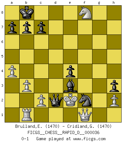 Last move : 0-1 2010 April 4 10:30:46 [Event "FICGS__CHESS__RAPID_D__000036"] [Site "FICGS"] [Date "2010.03.02"] [Round "1"] [White "Brulland,Emmanuel"] [Black "Cridland,Graham"] [Result "0-1"] [WhiteElo "1470"] [BlackElo "1470"] 1.b3 e5 2.g3 d5 3.Bb2 Nc6 4.Bg2 Be6 5.e3 Qd7 6.Ne2 Bc5 7.d3 O-O-O 8.Nd2 f5 9.O-O Nf6 10.Nf3 e4 11.dxe4 fxe4 12.Nfd4 h5 13.Nxe6 Qxe6 14.Nf4 Qf7 15.Bxf6 gxf6 16.Bh3+ Kb8 17.Be6 Qh7 18.Bxd5 h4 19.g4 h3 20.a3 Ne5 21.Qe2 Rxd5 22.Nxd5 Nxg4 23.Kh1 f5 24.Nf4 Bd6 25.f3 Ne5 26.fxe4 fxe4 27.Rf2 Qh4 28.a4 Ng4 29.R2f1 Bc5 30.Ne6 Bxe3 31.Rf8+ Rxf8 32.Nxf8 Nf2+ 33.Kg1 Qg5+ 34.Kf1 Qg2+ 35.Ke1 Qg1+ 36.Qf1 Qg7 37.Rb1 Qc3+ 38.Ke2 Qd2+ 0-1 Nimzovich-Larsen attack : Modern variation Queenside Castling by player Black (move 7) Kingside Castling by player White (move 9) Player Black won this chess game. Follow this game move after move (download)All Chess players should have a hobby. (Savielly Tartakower) Im Schach nämlich geht es darum, daß Ich des Gegners klein zu kriegen, sein Ego zu zerbrechen und zu zermahlen, seine Selbstachtung zu zertreten und zu verscharren und seine ganze mißachtenswerte sogenannte Persönlichkeit ein für alle Mal tot zu hacken und zu zerstampfen und dadurch die menschliche Gesellschaft von einer stinkenden Pestbeule zu befreien. Es ist ein königliches Spiel. (Robert James Fischer) La enorme capacidad mental, en la que sin ella no puede un jugador de Ajedrez existir, es demasiado requerida por el Ajedrez al grado de que nunca podrá liberar su mente de este juego. (Albert Einstein) Mais n'est-ce pas déjà le limiter injurieusement que d'appeler les échecs un jeu? N'est-ce pas aussi une science, un art, ou quelque chose qui, comme le cercueil de Mahomet entre ciel et terre, est suspendu entre l'un et l'autre, et qui réunit un nombre incroyable de contraires ? (Stefan Zweig) In God we trust, all others we virus scan. (Anonymous)