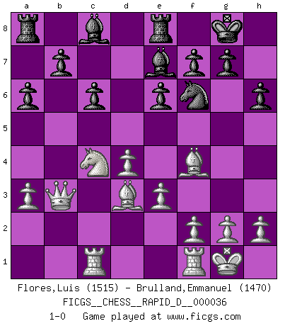 Last move : 1-0 2010 March 7 16:1:53 [Event "FICGS__CHESS__RAPID_D__000036"] [Site "FICGS"] [Date "2010.03.02"] [Round "1"] [White "Flores,Luis"] [Black "Brulland,Emmanuel"] [Result "1-0"] [WhiteElo "1515"] [BlackElo "1470"] 1.d4 d5 2.Bg5 h6 3.Bf4 Nf6 4.Nf3 e6 5.e3 Be7 6.Bd3 O-O 7.Nbd2 Re8 8.O-O a6 9.c4 c6 10.Rc1 Nbd7 11.a3 dxc4 12.Nxc4 Nb6 13.Nxb6 Qxb6 14.Ne5 Qxb2 15.Nc4 Qb3 16.Qxb3 1-0 Levitsky attack (Queen's Bishop attack) Kingside Castling by player Black (move 6) Kingside Castling by player White (move 8) Player White won this chess game. Follow this game move after move (download)Chess is really ninety nine percent calculation. (Soltis) Jeder leidlich begabte Spieler, er braucht keineswegs hervorragend veranlagt zu sein, kann es zum Meister bringen. Aber das ist ja auch gar nicht nötig! Der richtige Standpunkt ist es, zu seinem Vergnügen zu spielen, und man glaube ja nicht, dass der Genuss proportional dem Können sei. (Siegbert Tarrasch) Antes de los Finales, los dioses han colocado el Juego Medio. (Siegbert Tarrasch) Il s'avisa de me proposer d'apprendre les échecs qu'il jouait un peu... me voilà forcené des échecs. J'achète un échiquier, je m'enferme dans ma chambre, j'y passe des jours et des nuits à vouloir apprendre par cur toutes les parties. (Jean-Jacques Rousseau, Confessions) Follow your passion, and success will follow you. (Arthur Buddhold)