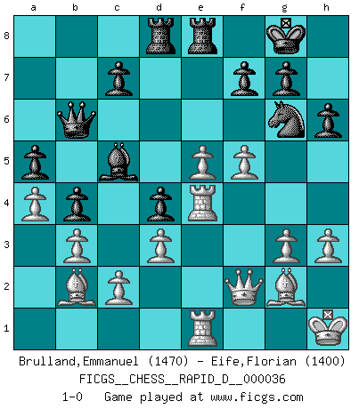 Last move : 1-0 2010 May 20 20:25:55 [Event "FICGS__CHESS__RAPID_D__000036"] [Site "FICGS"] [Date "2010.03.02"] [Round "1"] [White "Brulland,Emmanuel"] [Black "Eife,Florian"] [Result "1-0"] [WhiteElo "1470"] [BlackElo "1400"] 1.b3 e5 2.g3 d5 3.Bb2 Nc6 4.Bg2 Nf6 5.e3 Bc5 6.d3 Bf5 7.Ne2 O-O 8.Nd2 Qd7 9.O-O a5 10.a3 b5 11.Re1 Rfe8 12.Nf3 h6 13.Nh4 Bg4 14.Qd2 d4 15.e4 b4 16.a4 Rad8 17.Kh1 Bxe2 18.Qxe2 Ne7 19.Nf3 Ng4 20.h3 Nf6 21.Rad1 Qc6 22.Nxe5 Qd6 23.Nc4 Qa6 24.f4 Nd7 25.Qf2 Rf8 26.e5 Nb6 27.Nxb6 Qxb6 28.Re4 Ng6 29.Rde1 Rfe8 30.f5 1-0 This chess game has been lost on time (started : 2010.03.02 22:1:16) Nimzovich-Larsen attack : Modern variation Kingside Castling by player Black (move 7) Kingside Castling by player White (move 9) Player White won this chess game. Follow this game move after move (download)Help your pieces so they can help you. (Paul Morphy) Je mehr ich von der FIDE weiss, um so weniger verstehe ich. (Alexander Kalifman) El pensamiento metódico es mas útil en el Ajedrez que la inspiración. (C. J. S. Purdy) Des points faibles ou des trous dans la position de l'adversaire doivent être occupés par des pièces et non pas par des pions. (Siegbert Tarrasch) Work expands to fill the time available. (C. Northcote Parkinson, in Parkinson's Laws)