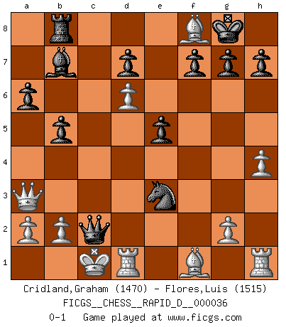Last move : 0-1 2010 March 21 12:4:57 [Event "FICGS__CHESS__RAPID_D__000036"] [Site "FICGS"] [Date "2010.03.02"] [Round "1"] [White "Cridland,Graham"] [Black "Flores,Luis"] [Result "0-1"] [WhiteElo "1470"] [BlackElo "1515"] 1.e4 c5 2.Nf3 Nc6 3.d4 cxd4 4.Nxd4 e5 5.Nb5 a6 6.Nd6+ Bxd6 7.Qxd6 Qf6 8.Qa3 Nge7 9.Nc3 Rb8 10.Be3 b5 11.Nd5 Nxd5 12.exd5 Ne7 13.O-O-O Bb7 14.d6 Nd5 15.h4 O-O 16.Bg5 Qxf2 17.Be7 Ne3 18.Bxf8 Qxc2+ 0-1 Sicilian : Labourdonnais-Loewenthal variation Queenside Castling by player White (move 13) Kingside Castling by player Black (move 15) Player Black won this chess game. Follow this game move after move (download)Chess is thirty to forty percent psychology. You don't have this when you play a computer. I can't confuse it. (Judith Polgar) Ich hatte Angst gegen einen russischen Großmeister zu verlieren, und er befürchtete gegen einen kleinen Jungen zu verlieren. (über ein Remis gegen Juri Awerbach). (Robert James Fischer) El Ajedrez es el gimnasio de la mente. (Blaise Pascal) La vie et les Echecs sont tous les deux une lutte constante. (Lasker) Ah, the Socrating method. The best way we have of teaching everything-apart from juggling chainsaws. (Gregory House, House M.D.)