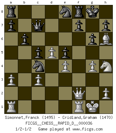 Last move : 1/2-1/2 2010 March 22 19:30:59 [Event "FICGS__CHESS__RAPID_D__000036"] [Site "FICGS"] [Date "2010.03.02"] [Round "1"] [White "Simonnet,Franck"] [Black "Cridland,Graham"] [Result "1/2-1/2"] [WhiteElo "1495"] [BlackElo "1470"] 1.d4 Nf6 2.c4 e6 3.Nc3 Bb4 4.a3 Bxc3+ 5.bxc3 c5 6.e3 d6 7.Nf3 O-O 8.Bd3 Nc6 9.O-O e5 10.d5 Na5 11.e4 Ne8 12.Bg5 Qc7 13.Nh4 g6 14.f4 b6 15.fxe5 dxe5 16.Qf3 Ba6 17.Bh6 Ng7 18.g4 Bxc4 19.Bxc4 Nxc4 20.Qf6 Ne8 21.Qf2 Ng7 22.Qf6 Ne8 23.Qf2 1/2-1/2 Nimzo-Indian : Saemisch variation Kingside Castling by player Black (move 7) Kingside Castling by player White (move 9) This chess game ended in a draw. Follow this game move after move (download)I have always a slight feeling of pity for the man who has no knowledge of Chess. (Siegbert Tarrasch) Ich habe Kasparov in Rente geschickt. (Veselin Topalov) Uno no tiene que jugar muy bien, es suficiente jugar mejor que el oponente. (Siegbert Tarrasch) Psychologiquement, tu dois avoir confiance en toi même, mais cette confiance doit être basée sur des faits. (Robert Fischer) Over-the-board chess is the favorite of mortals, correspondence chess is the favorite of the gods. (Eduard Dyckhoff)