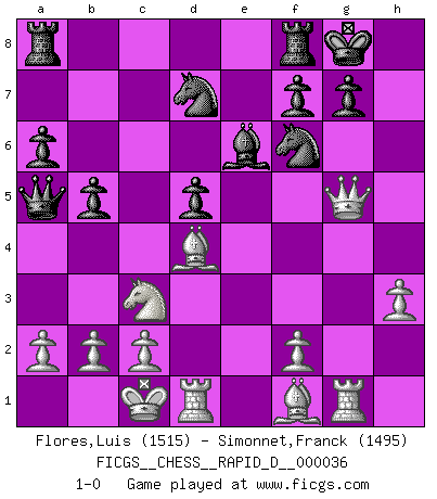 Last move : 1-0 2010 March 18 15:50:42 [Event "FICGS__CHESS__RAPID_D__000036"] [Site "FICGS"] [Date "2010.03.02"] [Round "1"] [White "Flores,Luis"] [Black "Simonnet,Franck"] [Result "1-0"] [WhiteElo "1515"] [BlackElo "1495"] 1.e4 c5 2.Nf3 d6 3.d4 cxd4 4.Nxd4 Nf6 5.Nc3 a6 6.Be3 e6 7.g4 h6 8.Qf3 d5 9.exd5 exd5 10.h3 Bb4 11.Nde2 Bxc3+ 12.Nxc3 Be6 13.O-O-O Qa5 14.Bd4 Nbd7 15.Qe3 O-O 16.g5 hxg5 17.Qxg5 b5 18.Rg1 1-0 Sicilian : Najdorf, Byrne (English) attack Queenside Castling by player White (move 13) Kingside Castling by player Black (move 15) Player White won this chess game. Follow this game move after move (download)A great player and a great example for many. His book My 60 Memorable Games had a big impact on me. It is a shame he didn't continue to enrich the world of chess with his unparalleled understanding after 1972. (Jan Timman, about Bobby Fischer's death) Wie, soll nun auch die Opposition abgeschafft werden? Ja, es tut mir leid, Ihnen diesen Schmerz nicht ersparen zu können. (Aaron Nimzowitsch) Debes de llevar a tu oponente hacia un profundo y obscuro bosque donde 2+2=5, y el camino que conduce a la salida es suficientemente ancho para solamente uno. (Mikhail Tal) Nous sommes les pions de la mystérieuse partie d'Echecs jouée par Dieu. Il nous déplace, nous arrête, nous pousse encore, puis nous lance un à un dans la boîte du Néant. Epitaphe sur la tombe de David Janowsky (1868-1927). Computers are like Old Testament gods; lots of rules and no mercy. (Joseph Campbell)