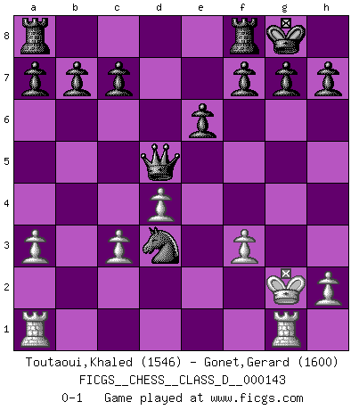 Last move : 0-1 2010 March 10 18:22:20 [Event "FICGS__CHESS__CLASS_D__000143"] [Site "FICGS"] [Date "2010.03.03"] [Round "1"] [White "Toutaoui,Khaled"] [Black "Gonet,Gerard"] [Result "0-1"] [WhiteElo "1546"] [BlackElo "1600"] 1.d4 d5 2.c4 Nc6 3.Nf3 Bg4 4.e3 e6 5.Be2 dxc4 6.Nc3 Bb4 7.Bxc4 Nf6 8.a3 Bxc3+ 9.bxc3 O-O 10.O-O Ne4 11.Bd2 Bxf3 12.gxf3 Nxd2 13.Qxd2 Ne5 14.Bd3 Nxf3+ 15.Kh1 Nxd2 16.Rg1 Qd5+ 17.e4 Nxe4 18.f3 Nf2+ 19.Kg2 Nxd3 0-1 QGD : Chigorin defense Kingside Castling by player Black (move 9) Kingside Castling by player White (move 10) Player Black won this chess game. Follow this game move after move (download)He who takes the Queen's Knight's Pawn will sleep in the streets. (Anonymous) Wenn Du absolut nicht mehr weißt, was Du tun sollst, dann ist es Zeit für Panik. (John van der Wiel) La enorme capacidad mental, en la que sin ella no puede un jugador de Ajedrez existir, es demasiado requerida por el Ajedrez al grado de que nunca podrá liberar su mente de este juego. (Albert Einstein) Des combinaisons [dans le jeu d'échecs] pareilles à des mélodies. Je crois entendre pour ainsi dire la musique des coups... (Vladimir Nabokov) When a man with money meets a man with experience, the man with experience leaves with money and the man with money leaves with experience. (Anonymous)