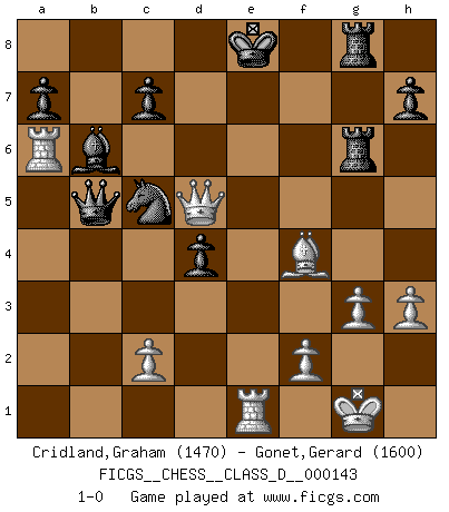 Last move : 1-0 2010 March 23 9:31:16 [Event "FICGS__CHESS__CLASS_D__000143"] [Site "FICGS"] [Date "2010.03.03"] [Round "1"] [White "Cridland,Graham"] [Black "Gonet,Gerard"] [Result "1-0"] [WhiteElo "1470"] [BlackElo "1600"] 1.e4 Nc6 2.Nf3 Nf6 3.e5 Ng4 4.d4 f6 5.exf6 Nxf6 6.Bc4 d5 7.Bd3 Bg4 8.Nbd2 Nxd4 9.h3 Nxf3+ 10.Nxf3 Bxf3 11.Qxf3 Qd6 12.O-O O-O-O 13.a4 e5 14.Bf5+ Kb8 15.a5 g6 16.a6 gxf5 17.axb7 f4 18.Qe2 e4 19.Ra6 Qb4 20.Bxf4 Qxb2 21.Rfa1 Bc5 22.Qd2 Qxb7 23.Qe1 Kc8 24.Qc3 Nd7 25.Be3 Qb4 26.Qg7 d4 27.Bg5 Rdg8 28.Qh6 Bb6 29.Bd2 Qb2 30.Qc6 Rg6 31.Qxe4 Rhg8 32.g3 Qb5 33.Bf4 Nc5 34.Qa8+ Kd7 35.Qd5+ Ke8 36.Re1+ 1-0 KP : Nimzovich defense Kingside Castling by player White (move 12) Queenside Castling by player Black (move 12) Player White won this chess game. Follow this game move after move (download)Chess is a terrible game. If you have no center, your opponent has a freer position. If you do have a center, then you really have something to worry about ! (Siegbert Tarrasch) Wie ich sie so einen nach dem anderen nieder mähte wurde meine Überlegenheit offensichtlich. (José Raúl Capablanca) Algunos sacrificios son sólidos, los demás son míos. (Mikhail Tal) D'abord les bases : Jouez et étudiez, puis étudiez et jouez, ensuite jouez et étudiez, puis étudiez et jouez. Deuxièmement : Donnez toujours le meilleur de vous-même ! (Ken Smith) Vladimir Ras-Putin is still alive... He is also a good actor, I saw him in the Lord of the Rings. (Rodolfo d'Ettorre)
