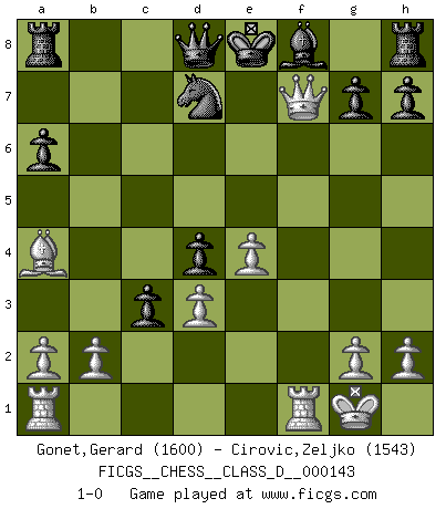 Last move : 1-0 2010 March 15 13:31:24 [Event "FICGS__CHESS__CLASS_D__000143"] [Site "FICGS"] [Date "2010.03.03"] [Round "1"] [White "Gonet,Gerard"] [Black "Cirovic,Zeljko"] [Result "1-0"] [WhiteElo "1600"] [BlackElo "1543"] 1.f4 d5 2.c4 dxc4 3.e4 e5 4.Bxc4 exf4 5.Nf3 c5 6.d3 Bg4 7.Bxf4 Bxf3 8.Qxf3 Nf6 9.O-O Nc6 10.Nc3 Nd4 11.Qg3 a6 12.Be5 b5 13.Bb3 b4 14.Ba4+ Nd7 15.Bxd4 cxd4 16.Qf4 bxc3 17.Qxf7+ 1-0 Mujannah Opening Kingside Castling by player White (move 9) Player White won this chess game. Follow this game move after move (download)The Pin is mightier than the sword. (Fred Reinfeld) Ich tröste mich mit dem Vergnügen, daß Schachfans, Zuschauer und Leser glücklich sind, wenn ein Großmeister etwas riskiert, statt nur Klötzchen zu schieben. (Mikhail Nekhemyevich Tal) Un jugador que trata de regresar una movida en el Ajedrez es un futuro carterista. (Richard Fenton) Le pion, dans sa simplicité, marche droit devant lui, mais lorsqu'il prend, il le fait obliquement? Ainsi l'homme, tant qu'il reste pauvre, marche dans la droiture et vit honnêtement, mais lorsqu'il recherche les honneurs, il flatte, se parjure et, par les voies obliques, cherche une position supérieure sur l'échiquier du monde. (Jean de Galles) To send light into the darkness of men's hearts - such is the duty of the artist. (Schumann)