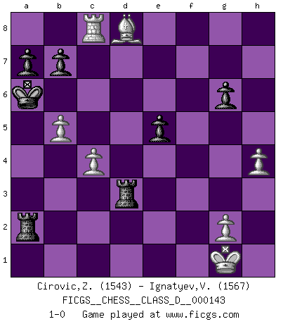 Last move : 1-0 2010 May 6 8:23:26 [Event "FICGS__CHESS__CLASS_D__000143"] [Site "FICGS"] [Date "2010.03.03"] [Round "1"] [White "Cirovic,Zeljko"] [Black "Ignatyev,Vladimir"] [Result "1-0"] [WhiteElo "1543"] [BlackElo "1567"] 1.e4 e5 2.Nf3 d6 3.b3 f5 4.exf5 Bxf5 5.d4 e4 6.Ng5 d5 7.f3 h6 8.fxe4 dxe4 9.Nxe4 Bxe4 10.Qh5+ g6 11.Qe5+ Qe7 12.c4 Qxe5 13.dxe5 Nc6 14.Bb2 Bg7 15.Nd2 Bf5 16.Nf3 O-O-O 17.Be2 Bd3 18.Bxd3 Rxd3 19.O-O Nge7 20.Rfe1 Nf5 21.h4 Re8 22.Re4 Nd6 23.exd6 Rxe4 24.Bxg7 cxd6 25.Bxh6 Ne5 26.Nxe5 dxe5 27.Bg5 Kd7 28.Rf1 Re2 29.Rf8 Kc6 30.b4 Rxa2 31.Rc8+ Kb6 32.Bd8+ Ka6 33.b5+ 1-0 Philidor's defense Queenside Castling by player Black (move 16) Kingside Castling by player White (move 19) Player White won this chess game. Follow this game move after move (download)The older I grow, the more I value pawns. (Paul Keres) Ich spiele 70 Eröffnungssysteme. (Viktor Kortschnoi) El Ajedrez demanda una total concentración. (Bobby Fischer) Botvinnik disait en comparant les échecs à la musique: Il existe une science dont le but est l'étude de l'acoustique et des sons. Mais il y a aussi un art qui se sert de l'océan des sons : c'est la musique. De toute évidence, il en est de même pour la pensée. La logique est l'étude des lois de la réflexion et les échecs reflètent, en tant qu'art, le côté logique de la réflexion, sous la forme d'images artistiques... Extrait de Fischer - Spassky, Reykjavik 1972 par Alexander & F. Wyndham (Ed. Solar), p 37. A good aphorism is too hard for the tooth of time, and is not worn away with the centuries, although it serves as food for every speech. (Friedrich Nietzsche)