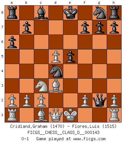 Last move : 0-1 2010 March 12 7:12:37 [Event "FICGS__CHESS__CLASS_D__000143"] [Site "FICGS"] [Date "2010.03.03"] [Round "1"] [White "Cridland,Graham"] [Black "Flores,Luis"] [Result "0-1"] [WhiteElo "1470"] [BlackElo "1515"] 1.e4 c5 2.Nf3 Nc6 3.d4 cxd4 4.Nxd4 e5 5.Nb5 a6 6.Nd6+ Bxd6 7.Qxd6 Qf6 8.Qd1 Qg6 9.Nc3 d5 10.exd5 Nd4 11.Bd3 Qxg2 0-1 Sicilian : Labourdonnais-Loewenthal variation Player Black won this chess game. Follow this game move after move (download)Fischer is the strongest player in the world. In fact, the strongest player who ever lived. (Larry Evans) Wie bekannt hörte Morphy 1859 auf, Schach zu spielen. Seine Enttäuschung galt nicht so sehr dem Schach, wie den Schachspielern. (Robert James Fischer) La enorme capacidad mental, en la que sin ella no puede un jugador de Ajedrez existir, es demasiado requerida por el Ajedrez al grado de que nunca podrá liberar su mente de este juego. (Albert Einstein) Je fais ceci parce que dans cinquante coups j'obtiendrai cela; je m'appelle Mikhail Moisevitch Botvinnik. (Botvinnik) Life is pain my dear and anyone who says otherwise is selling something. (Princess Bride)