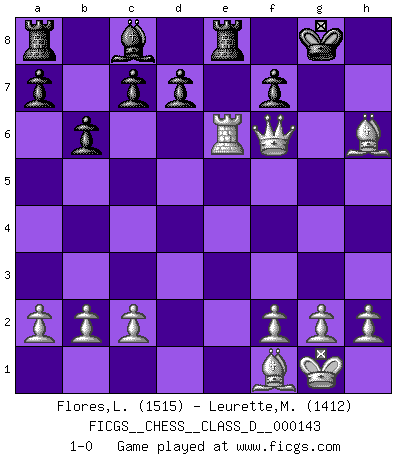 Last move : 1-0 2010 March 12 11:46:25 [Event "FICGS__CHESS__CLASS_D__000143"] [Site "FICGS"] [Date "2010.03.03"] [Round "1"] [White "Flores,Luis"] [Black "Leurette,Marc-Antoine"] [Result "1-0"] [WhiteElo "1515"] [BlackElo "1412"] 1.e4 e5 2.Nf3 Nc6 3.Bb5 Nf6 4.O-O Nxe4 5.Re1 Nd6 6.Nxe5 Nxe5 7.Rxe5+ Be7 8.Bf1 O-O 9.Nc3 b6 10.d4 h6 11.Nd5 Bf6 12.Qf3 Bxe5 13.dxe5 Nb7 14.Nf6+ gxf6 15.exf6 Qxf6 16.Qxf6 Nc5 17.Bxh6 Ne6 18.Re1 Re8 19.Rxe6 1-0 Ruy Lopez : Berlin defense, Open variation Kingside Castling by player White (move 4) Kingside Castling by player Black (move 8) Player White won this chess game. Follow this game move after move (download)First-class players lose to second-class players because second-class players sometimes play a first-class game. (Siegbert Tarrasch) Schach ist Krieg, im Schach geht es um testosterongesteuerte Urschreie. (Garry Kasparov) El jugador táctico debe saber que hacer cuando algo se debe de hacer. El estratégico debe saber que hacer cuando nada se debe de hacer. (Savielly Tartakover) Soyez une menace à chaque fois que vous vous asseyez pour jouer. (Ken Smith) As the days dwindle down... to a precious few. (Maxwell Anderson)