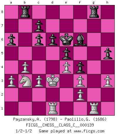 Last move : 1/2-1/2 2010 April 18 15:26:36 [Event "FICGS__CHESS__CLASS_C__000139"] [Site "FICGS"] [Date "2010.03.04"] [Round "1"] [White "Payzansky,Aleksey"] [Black "Paolillo,Giampiero"] [Result "1/2-1/2"] [WhiteElo "1798"] [BlackElo "1686"] 1.e4 e5 2.Nf3 Nc6 3.Bb5 a6 4.Ba4 d6 5.O-O Bg4 6.h3 h5 7.c3 Qf6 8.d4 Bxf3 9.Bxc6+ bxc6 10.Qxf3 Qxf3 11.gxf3 f6 12.Nd2 Ne7 13.Nc4 Ng6 14.Rd1 Nh4 15.Rd3 g5 16.dxe5 fxe5 17.Kf1 Be7 18.Ke2 Ng6 19.b4 Rb8 20.Na5 Kd7 21.Be3 Nf4+ 22.Bxf4 gxf4 23.Rg1 Rhg8 24.R3d1 Bf6 25.a3 Be7 26.Nc4 Bf6 27.Kd3 Ke6 28.Na5 Kd7 29.Nb3 Ke6 30.Na5 Kd7 31.Nb3 Ke6 1/2-1/2 Ruy Lopez : Modern Steinitz defense, 5.O-O Kingside Castling by player White (move 5) This chess game ended in a draw. Follow this game move after move (download)It is peculiar but a fact nevertheless, that gamblers in chess always have enthusiastic followers. (Botvinnik) Ich verachte Kasparow. (Viktor Kortschnoi) Bobby es la celebridad menos entendida y malinterpretada que camina el la faz de esta tierra. (Yasser Seirawan) Mon pion favori sur ma case favorite ! Bronstein en parlant d'un coup de pion en h5 quand il avait les Noirs. Men should grow up. - Yeah. And dogs should stop licking themselves. It's not gonna happen. (Gregory House to Dr. Cameron, House M.D.)
