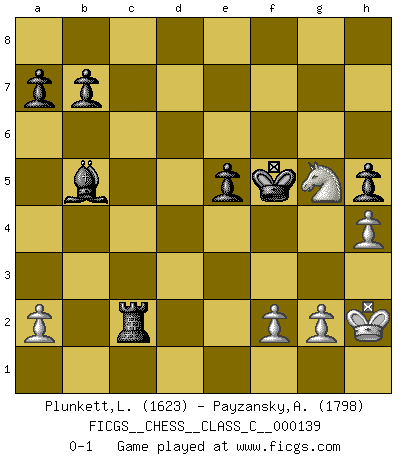 Last move : 0-1 2010 May 13 22:18:56 [Event "FICGS__CHESS__CLASS_C__000139"] [Site "FICGS"] [Date "2010.03.04"] [Round "1"] [White "Plunkett,Louis"] [Black "Payzansky,Aleksey"] [Result "0-1"] [WhiteElo "1623"] [BlackElo "1798"] 1.d4 Nf6 2.c4 g6 3.Nc3 d5 4.cxd5 Nxd5 5.e4 Nxc3 6.bxc3 Bg7 7.Bc4 c5 8.Be3 Qa5 9.Bd2 O-O 10.Ne2 Nd7 11.h4 Nb6 12.Bb3 h5 13.Kf1 Bd7 14.c4 Qa6 15.Be3 Nxc4 16.Bxc4 Qxc4 17.Kg1 Ba4 18.Qd2 Bb5 19.Re1 cxd4 20.Bh6 Bxh6 21.Qxh6 d3 22.Nf4 d2 23.Kh2 dxe1Q 24.Rxe1 Qc3 25.e5 Qxe1 26.Nxg6 f6 27.Qh8+ Kf7 28.Qh7+ Ke6 29.Qxe7+ Kf5 30.Nxf8 Qxe5+ 31.Qxe5+ fxe5 32.Nh7 Rc8 33.Ng5 Rc2 0-1 King's Indian defense, 3.Nc3 Kingside Castling by player Black (move 9) Promotion Queen by player Black (move 23) Player Black won this chess game. Follow this game move after move (download)Mistrust is the most necessary characteristic of the Chess player. (Siegbert Tarrasch) Im Spitzenschach von heute geht es nur um Vorbereitung, um tiefgründige, sorgfältige Eröffnungsvorbereitung. (Nigel Short) El Ajedrez es un invernadero donde los frutos del carácter pueden madurar mas completamente que en la vida. (Edward Morgan Foster) Les pièces de l'échiquier étaient impitoyables. Elles le retenaient, elles l'absorbaient. Il y avait de l'horreur en cela, mais aussi une harmonie unique. Car, qu'y a-t-il dans le monde, à part les échecs ? (V. Nabokov) Thus, what is of supreme importance in war is to attack the enemy's strategy. (Sun Tzu)