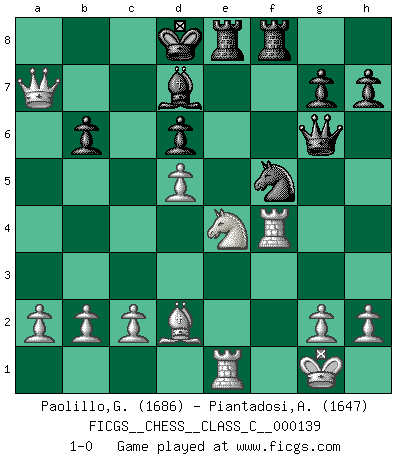 Last move : 1-0 2010 April 18 0:17:11 [Event "FICGS__CHESS__CLASS_C__000139"] [Site "FICGS"] [Date "2010.03.04"] [Round "1"] [White "Paolillo,Giampiero"] [Black "Piantadosi,Angelo"] [Result "1-0"] [WhiteElo "1686"] [BlackElo "1647"] 1.e4 e5 2.Nc3 Nf6 3.f4 Nc6 4.fxe5 Nxe5 5.d4 Nc6 6.e5 Ng8 7.Nf3 d6 8.Bb5 Bd7 9.O-O dxe5 10.Bxc6 Bxc6 11.Nxe5 Bd6 12.Nxf7 Qh4 13.Nxd6+ cxd6 14.Re1+ Ne7 15.d5 Bd7 16.Re4 Qf6 17.Qe2 Rf8 18.Bd2 Kd8 19.Rf4 Nf5 20.Qd3 Qg6 21.Ne4 Ke7 22.Re1 Rae8 23.Qa3 Kd8 24.Qa5+ b6 25.Qxa7 1-0 Vienna : Falkbeer variation Kingside Castling by player White (move 9) Player White won this chess game. Follow this game move after move (download)If a ruler does not understand Chess, how can he rule over a kingdom ? (King Khusros II) Die Idee von Capablanca, Schach als Fach in den Schulen zu lehren, ist großartig. (Fidel Castro) Yo tuve un dolor de muelas en la primer partida. En el segundo juego, tuve un dolor de cabeza. En el tercero, tuve un ataque de reumatísmo. En la cuarta partida, no me sentía muy bien. ¿Y en el quinto juego? Bueno, ¿que acaso uno tiene que ganar todos los juegos?. (Siegbert Tarrasch) D'abord les bases : Jouez et étudiez, puis étudiez et jouez, ensuite jouez et étudiez, puis étudiez et jouez. Deuxièmement : Donnez toujours le meilleur de vous-même ! (Ken Smith) If computers get too powerful, we can organize them into committees. That'll do them in. (Anonymous)