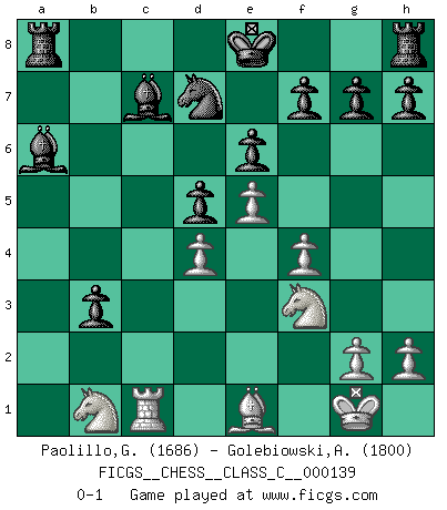 Last move : 0-1 2010 April 24 10:27:2 [Event "FICGS__CHESS__CLASS_C__000139"] [Site "FICGS"] [Date "2010.03.04"] [Round "1"] [White "Paolillo,Giampiero"] [Black "Golebiowski,Adam"] [Result "0-1"] [WhiteElo "1686"] [BlackElo "1800"] 1.e4 e6 2.d4 d5 3.Nd2 Nf6 4.e5 Nfd7 5.f4 c5 6.c3 Nc6 7.Ngf3 cxd4 8.cxd4 Qb6 9.Nb3 a5 10.Be3 a4 11.Nbd2 Qxb2 12.Rb1 Qa3 13.Bf2 Nb4 14.Bb5 Nd3+ 15.Bxd3 Qxd3 16.Rb2 Ba3 17.Qc2 Qxc2 18.Rxc2 b5 19.O-O Ba6 20.Nb1 b4 21.Re1 b3 22.axb3 axb3 23.Rc7 Bb4 24.Rec1 Ba5 25.Be1 Bxc7 0-1 French : Tarrasch, Closed variation Kingside Castling by player White (move 19) Player Black won this chess game. Follow this game move after move (download)There are two classes of men; those who are content to yield to circumstances and who play whist; those who aim to control circumstances, and who play Chess. (Mortimer Collins) Man gibt nur Pakete auf. (Paul Keres) Aquellos que dicen que entienden al Ajedrez, no entienden nada. (Robert Hubner) Ce qui caractérise les parties de combat, c'est que si le défenseur a constamment de difficiles problèmes à résoudre, l'attaquant doit chercher sans relâche de nouvelles possibilités d'attaque. (Koblentz) It's not enough to succeed. Others must fail. (Gore Vidal)