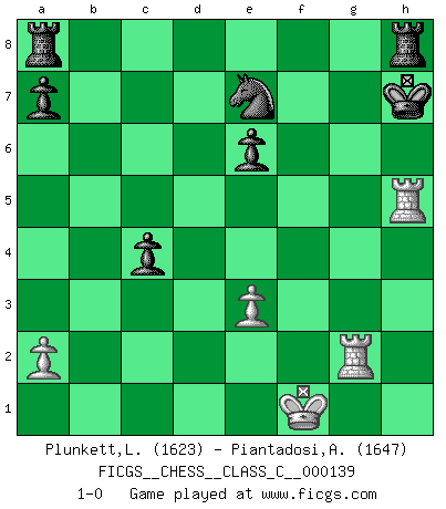 Last move : 1-0 2010 May 5 17:10:47 [Event "FICGS__CHESS__CLASS_C__000139"] [Site "FICGS"] [Date "2010.03.04"] [Round "1"] [White "Plunkett,Louis"] [Black "Piantadosi,Angelo"] [Result "1-0"] [WhiteElo "1623"] [BlackElo "1647"] 1.d4 Nf6 2.c4 g6 3.Nc3 d5 4.cxd5 Nxd5 5.e4 Nxc3 6.bxc3 Bg7 7.Bc4 O-O 8.Ne2 c5 9.Be3 Nc6 10.Rc1 Qa5 11.Kf1 b5 12.Bd5 Bb7 13.h4 e6 14.Bb3 Rfd8 15.h5 c4 16.hxg6 fxg6 17.Bc2 b4 18.e5 bxc3 19.Nxc3 Bxe5 20.Rxh7 Bxd4 21.Bxg6 Bxc3 22.Qh5 Qxh5 23.Rxh5 Bd2 24.Rc2 Bxe3 25.fxe3 Ne7 26.Bh7+ Kg7 27.Rf2 Rh8 28.Rb5 Bxg2+ 29.Rxg2+ Kxh7 30.Rh5+ 1-0 King's Indian defense, 3.Nc3 Kingside Castling by player Black (move 7) Player White won this chess game. Follow this game move after move (download)Why must I lose to this idiot ? (Aron Nimzovich) Wenn Capablanka heute auf der Schachbühne erscheinen würde, hätte er ein halbes Jahr gebraucht um sich die Schachtheorie anzueignen. Und dann hätte er alles und jeden besiegt. (Mikhail Moiseyevich Botvinik) El jugador táctico debe saber que hacer cuando algo se debe de hacer. El estratégico debe saber que hacer cuando nada se debe de hacer. (Savielly Tartakover) Un footballeur joue avec ses pieds, parfois avec sa tête. Un joueur d'échecs ne joue qu'avec sa tête. Et quand il ne joue plus, il meurt. (Jacob Murray) Control your own destiny or someone else will. (Jack Welch)