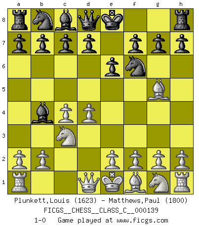 Last move : 1-0 2010 April 21 9:18:4 [Event "FICGS__CHESS__CLASS_C__000139"] [Site "FICGS"] [Date "2010.03.04"] [Round "1"] [White "Plunkett,Louis"] [Black "Matthews,Paul"] [Result "1-0"] [WhiteElo "1623"] [BlackElo "1800"] 1.d4 Nf6 2.c4 e6 3.Nc3 Bb4 4.Bg5 1-0 This chess game has been lost on time (started : 2010.03.04 9:58:35) Nimzo-Indian : Leningrad variation Player White won this chess game. Follow this game move after move (download)As one by one I mowed them down, my superiority soon became apparent. (Jose Capablanca) Frage des Reporters: -Welche besonderen Umstände rechtfertigen das Anhalten der Uhren während einer Turnierpartie? Antwort: -Einen Fotographen zu strangulieren. (Siegbert Tarrasch) Los Peones son nacidos libres, y aún así, se encuentran por doquier encadenados. (Rick Kennedy) Les échecs sont un jeu terrible. Si vous n'avez pas le centre, votre adversaire a une position plus libre. Par contre, si vous avez le centre, alors vous avez vraiment quelque chose pour laquelle vous inquiéter ! (Siegbert Tarrasch) In theory there is no difference between theory and practice. In practice there is. (Yogi Berra)