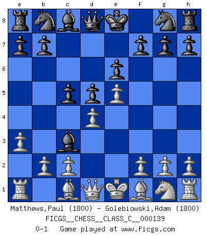 Last move : 0-1 2010 April 15 20:57:24 [Event "FICGS__CHESS__CLASS_C__000139"] [Site "FICGS"] [Date "2010.03.04"] [Round "1"] [White "Matthews,Paul"] [Black "Golebiowski,Adam"] [Result "0-1"] [WhiteElo "1800"] [BlackElo "1800"] 1.e4 e6 2.d4 d5 3.Nc3 Bb4 4.e5 c5 5.a3 Bxc3+ 0-1 This chess game has been lost on time (started : 2010.03.04 9:58:35) French : Winawer, Advance, 5.a3 Player Black won this chess game. Follow this game move after move (download)My style is somewhere between that of Tal and Petrosian. (Reshevsky) Die Partien sind immer verschieden, die Interviews immer die gleichen. (Garry Kasparov) Cuando tu casa esta en llamas, no puedes ser molestado por tus vecinos. O, como decinos en Ajedrez, si tu Rey esta bajo ataque, no te preocupa perder un Peón del lado de la Reina. (Gary Kasparov) Mon pion favori sur ma case favorite ! Bronstein en parlant d'un coup de pion en h5 quand il avait les Noirs. The message for business people contemplating their place in the cyberspace is simple and direct: get linked or get lost. (Vic Sussman and Kenan Pollack)