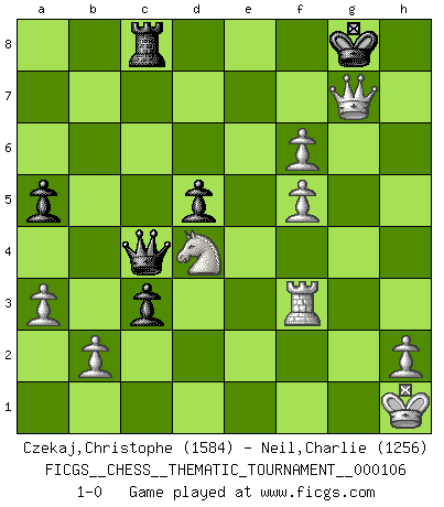 Last move : 1-0 2010 June 9 9:5:22 [Event "FICGS__CHESS__THEMATIC_TOURNAMENT__000106"] [Site "FICGS"] [Date "2010.03.05"] [Round "1"] [White "Czekaj,Christophe"] [Black "Neil,Charlie"] [Result "1-0"] [WhiteElo "1584"] [BlackElo "1256"] 1.e4 e6 2.d4 d5 3.Nc3 Nf6 4.Bg5 Bb4 5.e5 h6 6.Bd2 Ne4 7.Nxe4 Bxd2+ 8.Nxd2 c5 9.dxc5 Nd7 10.Bb5 Qa5 11.Bxd7+ Bxd7 12.Ne2 Qxc5 13.O-O O-O 14.c3 Bc6 15.Nf3 Rac8 16.Nfd4 a6 17.Qd3 Qe7 18.f4 Qc5 19.Kh1 Qb6 20.Qd2 Bb5 21.Rf3 Rc7 22.Nxb5 Qxb5 23.Nd4 Qc4 24.g4 Rfc8 25.a3 b5 26.f5 exf5 27.gxf5 a5 28.Rg1 b4 29.Qxh6 f6 30.exf6 bxc3 31.Rxg7+ Rxg7 32.Qxg7+ 1-0 French : MacCutcheon, Advance variation Kingside Castling by player White (move 13) Kingside Castling by player Black (move 13) Player White won this chess game. Follow this game move after move (download)I love all positions. Give me a difficult positional game, I will play it. But totally won positions, I cannot stand them. (Hein Donner) Es ist schade, dass viele Schachsportler vergessen, wie wichtig Auftreten und angemessene Kleidung sind. (Alexandra Kosteniuk) El sobresalir en el Ajedrez es un signo de una mente intrigante. (Sir Arthur Conan Doyle) Les échecs c'est le défi de l'alpiniste, toujours plus haut, prêt à tout pour monter à l'assaut du Roi ennemi. Les échecs, c'est de la musique en mouvement, un ballet majestueux pour les yeux. C'est de la poésie composée par les fantômes du passé qui au même titre que Rimbaud ou Verlaine méritent notre admiration. Les échecs, c'est de la peinture ou le moindre mouvement modifie le tableau pour en faire un Picasso ou un Van Gogh. Les échecs, c'est tout et rien, c'est la vie et la mort. Jjulie33 sur le forum de France-Echecs. Political correctness is subjecting us to gross incompetence. (Johann Piek)