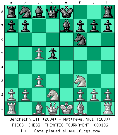Last move : 1-0 2010 April 16 8:59:44 [Event "FICGS__CHESS__THEMATIC_TOURNAMENT__000106"] [Site "FICGS"] [Date "2010.03.05"] [Round "1"] [White "Bencheikh,Ilf"] [Black "Matthews,Paul"] [Result "1-0"] [WhiteElo "2094"] [BlackElo "1800"] 1.e4 e6 2.d4 d5 3.Nd2 c5 4.exd5 exd5 5.Ngf3 Nf6 6.c3 Be7 7.dxc5 1-0 This chess game has been lost on time (started : 2010.03.05 18:8:8) French : Tarrasch, Open, 4.ed ed Player White won this chess game. Follow this game move after move (download)It is difficult to play against Einstein's theory --on his first loss to Fischer. (Mikhail Tal) Ich verachte Kasparow. (Viktor Kortschnoi) El Ajedrez detiene a su maestro dentro de sus propios vínculos, encadenando la mente y el cerebro, por lo que la libertad interior del mas fuerte debe sufrir. (Albert Einstein) Le génie consiste à savoir transgresser les règles au moment opportun. (Teichmann) Employ the attack like tactic of defense. (Chinese proverb)