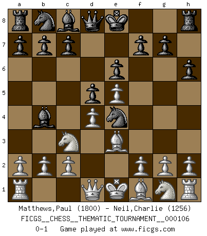 Last move : 0-1 2010 April 17 9:14:55 [Event "FICGS__CHESS__THEMATIC_TOURNAMENT__000106"] [Site "FICGS"] [Date "2010.03.05"] [Round "1"] [White "Matthews,Paul"] [Black "Neil,Charlie"] [Result "0-1"] [WhiteElo "1800"] [BlackElo "1256"] 1.e4 e6 2.d4 d5 3.Nc3 Nf6 4.Bg5 Bb4 5.e5 h6 6.Be3 Ne4 0-1 This chess game has been lost on time (started : 2010.03.05 18:8:8) French : MacCutcheon, Janowski variation Player Black won this chess game. Follow this game move after move (download)I thought the most common mistake [in chess] was the first one: Learning the game :P (Garvin Gray, FICGS forum) Das Zentrum ist der Balkan des Schachbretts - Kriegshandlungen können in jedem Moment ausbrechen. (Aaron Nimzowitsch) Cuando tu casa esta en llamas, no puedes ser molestado por tus vecinos. O, como decinos en Ajedrez, si tu Rey esta bajo ataque, no te preocupa perder un Peón del lado de la Reina. (Gary Kasparov) J'ai vu le vaincu d'Echecs jouer des années durant dans l'espoir de la fête de la victoire. Car tu es plus riche de ce qu'elle existe si même elle n'est point pour toi. Ainsi de la perle du fond des mers. (Antoine de Saint-Exupéry) Creativity involves breaking out of established patterns in order to look at things in a different way. (Edward De Bono)