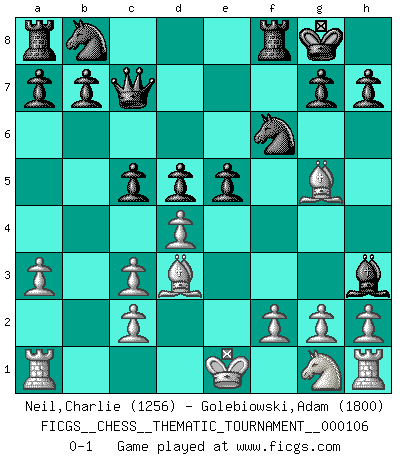 Last move : 0-1 2010 March 15 15:28:46 [Event "FICGS__CHESS__THEMATIC_TOURNAMENT__000106"] [Site "FICGS"] [Date "2010.03.05"] [Round "1"] [White "Neil,Charlie"] [Black "Golebiowski,Adam"] [Result "0-1"] [WhiteElo "1256"] [BlackElo "1800"] 1.e4 e6 2.d4 d5 3.Nc3 Bb4 4.e5 c5 5.a3 Bxc3+ 6.bxc3 Qc7 7.Qg4 f5 8.exf6 Nxf6 9.Qh3 O-O 10.Bd3 e5 11.Bg5 Bxh3 0-1 French : Winawer, Classical variation Kingside Castling by player Black (move 9) Player Black won this chess game. Follow this game move after move (download)Avoid the crowd. Do your own thinking independently. Be the Chess player, not the Chess piece. (Ralph Charell) Der 70jährige Viktor Kortschnoi: Die Rentenanstalt wollte mich zwingen in Rente zu gehen. Meine Frau erhält jetzt eine Pension- und ich zahle weiter in die Rentenkasse ein! (Viktor Kortschnoi) No es suficiente ser un buen jugador, se debe también de jugar bién. (Siegbert Tarrasch) Le plus grand jeu de l'esprit jamais inventé, plus vous l'apprenez, plus vous y prenez du plaisir. (Garry Kasparov) The Movers & Shakers of this world are those who play chess in the mornings and go to the disco in the evenings. (Dinesh De Silva)