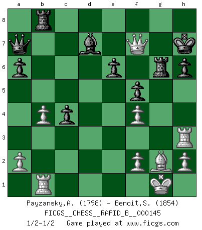 Last move : 1/2-1/2 2010 March 13 0:9:30 [Event "FICGS__CHESS__RAPID_B__000145"] [Site "FICGS"] [Date "2010.03.05"] [Round "1"] [White "Payzansky,Aleksey"] [Black "Benoit,Sebastien"] [Result "1/2-1/2"] [WhiteElo "1798"] [BlackElo "1854"] 1.e4 c5 2.Nf3 e6 3.d4 cxd4 4.Nxd4 Nc6 5.Nc3 a6 6.Be3 Nf6 7.Be2 Bb4 8.Nxc6 bxc6 9.Bf3 d5 10.exd5 cxd5 11.O-O O-O 12.Bd4 Bd6 13.g3 Rb8 14.Re1 Re8 15.Bxf6 gxf6 16.Rb1 Be5 17.Qd2 Qc7 18.Ne2 Bd7 19.c3 f5 20.Nf4 Bxf4 21.gxf4 Qc5 22.b4 Qa7 23.Re3 Red8 24.Bg2 h6 25.Rh3 Kh7 26.c4 dxc4 27.Qc3 Rg8 28.Qf6 Rg6 29.Qxf7+ Rg7 30.Qf6 Rg6 31.Qf7+ 1/2-1/2 Sicilian : Taimanov variation Kingside Castling by player White (move 11) Kingside Castling by player Black (move 11) This chess game ended in a draw. Follow this game move after move (download)Any material change in a position must come about by mate, a capture, or a Pawn promotion. (Purdy) Wie ich sie so einen nach dem anderen nieder mähte wurde meine Überlegenheit offensichtlich. (José Raúl Capablanca) En posiciones complicadas, Bobby Fischer pocas veces tuvo que temer de cualquiera. (Paul Keres) Les échecs c'est le défi de l'alpiniste, toujours plus haut, prêt à tout pour monter à l'assaut du Roi ennemi. Les échecs, c'est de la musique en mouvement, un ballet majestueux pour les yeux. C'est de la poésie composée par les fantômes du passé qui au même titre que Rimbaud ou Verlaine méritent notre admiration. Les échecs, c'est de la peinture ou le moindre mouvement modifie le tableau pour en faire un Picasso ou un Van Gogh. Les échecs, c'est tout et rien, c'est la vie et la mort. Jjulie33 sur le forum de France-Echecs. I know the human being and fish can coexist peacefully. (George W. Bush, Saginaw sept. 29, 2000)