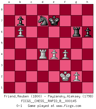Last move : 0-1 2010 July 17 22:18:35 [Event "FICGS__CHESS__RAPID_B__000145"] [Site "FICGS"] [Date "2010.03.05"] [Round "1"] [White "Friend,Reuben"] [Black "Payzansky,Aleksey"] [Result "0-1"] [WhiteElo "1800"] [BlackElo "1798"] 1.d4 Nf6 2.c4 g6 3.Nc3 d5 4.Nf3 Bg7 5.cxd5 Nxd5 6.Bd2 c5 7.Rc1 Nxc3 8.Bxc3 cxd4 9.Nxd4 O-O 10.e3 e5 11.Nb5 Nc6 12.Bc4 Qg5 13.Qf3 Qe7 14.O-O a6 15.Na3 Be6 16.Bxe6 Qxe6 17.b3 e4 18.Qf4 Bxc3 19.Rxc3 Rad8 20.Rc4 f5 21.Nc2 Qf6 22.h4 Rd2 23.a4 Ne5 24.Rc7 Qd6 25.Rc3 Rd3 26.Rxd3 exd3 27.Nd4 Re8 28.Rd1 Qc5 29.Nxf5 gxf5 30.Qg5+ Ng6 31.Rxd3 Qc1+ 32.Kh2 Qc7+ 33.Kg1 Qg7 34.Rd5 h6 35.Qxf5 Nxh4 36.Qh3 Ng6 37.Qg4 Re7 38.b4 Kh7 39.b5 Qa1+ 40.Rd1 Qf6 41.Rd7 axb5 42.axb5 Qa1+ 43.Rd1 Qe5 44.Qc4 Rc7 45.Qd3 Kg7 46.b6 Rf7 47.Qb3 Nf8 48.Rd4 Rd7 49.Rg4+ Ng6 50.Qc2 Qe6 51.Qc3+ Kh7 52.Rd4 Rg7 53.Qc5 Ne5 54.Kf1 Nd7 55.Qd6 Qg6 56.Qxg6+ Kxg6 57.e4 Kf6 58.f4 Ke7 59.Kf2 Rg6 0-1 King's Indian defense, 3.Nc3 Kingside Castling by player Black (move 9) Kingside Castling by player White (move 14) Player Black won this chess game. Follow this game move after move (download)Nonsense was the last thing Fischer was interested in, as far as Chess was concerned. (Elie Agur) Dein Körper muss in Topform sein. Dein Schach verfällt, wenn dein Körper verfällt. Der Körper kann nicht vom Geist getrennt werden. (Robert James Fischer) Un juego de Ajedrez es un dialogo, una conversación entre un jugador y su oponente. Cada movimiento del oponente puede contener amenazas o tropiezos, pero un jugador no se puede defender de las amenazas o tomar ventaja de los tropiezos si es que no se pregunta a sí mismo: ¿Que es lo que mi oponente va a hacer después de cada movida?. (Bruce A. Moon) C'est la seule position que je connaisse où les deux camps sont mals. Propos prêtés à V. Anand. A clear conscience is usually the sign of a bad memory. (Unknown)