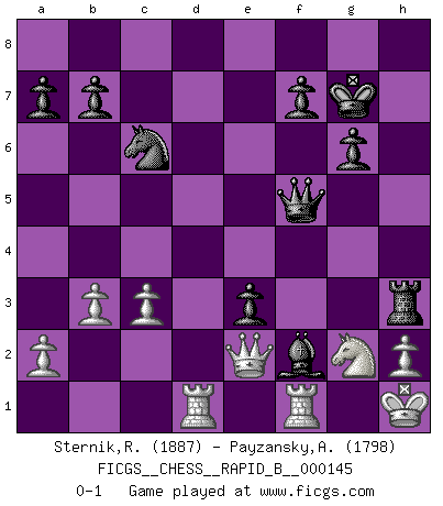 Last move : 0-1 2010 March 25 21:10:41 [Event "FICGS__CHESS__RAPID_B__000145"] [Site "FICGS"] [Date "2010.03.05"] [Round "1"] [White "Sternik,Ryszard"] [Black "Payzansky,Aleksey"] [Result "0-1"] [WhiteElo "1887"] [BlackElo "1798"] 1.e4 c5 2.Nf3 d6 3.d4 cxd4 4.Nxd4 Nf6 5.Nc3 g6 6.Be2 Bg7 7.O-O O-O 8.Kh1 Nc6 9.Nb3 Be6 10.f4 Qc8 11.Bf3 Bc4 12.Re1 Rd8 13.Nd5 e6 14.Nxf6+ Bxf6 15.Nd2 Ba6 16.c3 Qc7 17.Nb3 e5 18.g3 Bc4 19.Be3 Rac8 20.Bg4 exf4 21.gxf4 Qe7 22.Qc2 Rc7 23.Qg2 Bh4 24.Red1 Re8 25.e5 dxe5 26.Bc5 Qf6 27.Bd6 Rce7 28.Bxe7 Rxe7 29.f5 e4 30.fxg6 hxg6 31.Be2 Bxe2 32.Qxe2 Bf2 33.Nd2 e3 34.Nf3 Re4 35.Rf1 Qf5 36.Rad1 Kg7 37.b3 Rf4 38.Ne1 Rh4 39.Ng2 Rh3 0-1 Sicilian : Dragon variation Kingside Castling by player White (move 7) Kingside Castling by player Black (move 7) Player Black won this chess game. Follow this game move after move (download)We cannot resist the fascination of sacrifice, since a passion for sacrifices is part of a Chessplayer's nature. (Rudolf Spielman) Je mehr ich von der FIDE weiss, um so weniger verstehe ich. (Alexander Kalifman) Las Aperturas te enseñan aperturas. ¡Los Finales te enseñan Ajedrez!. (Stephan Gerzadowicz) Les échecs sont un jeu par leur forme, un art par leur essence et une science par sa difficulté d'acquisition. Ils peuvent vous procurer autant de plaisir qu'un bon livre ou une belle musique, mais vous n'aurez une réelle joie que si vous arrivez à bien jouer. (Tigran Petrosian) Wisdom doesn't necessarily come with age. Sometimes age just shows up all by itself. (Tom Wilson)