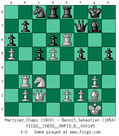 Last move : 1-0 2010 March 22 14:42:41 [Event "FICGS__CHESS__RAPID_B__000145"] [Site "FICGS"] [Date "2010.03.05"] [Round "1"] [White "Martinez,Chapo"] [Black "Benoit,Sebastien"] [Result "1-0"] [WhiteElo "1800"] [BlackElo "1854"] 1.d4 Nf6 2.c4 c5 3.d5 e6 4.Nf3 exd5 5.cxd5 d6 6.Nc3 g6 7.Nd2 Nbd7 8.g3 a6 9.a4 Bg7 10.Bg2 O-O 11.O-O Re8 12.h3 Rb8 13.Nc4 Nb6 14.Na3 Bd7 15.a5 Nc8 16.Nc4 Bb5 17.Qb3 Bxc4 18.Qxc4 Nd7 19.Ne4 h6 20.Qc2 Qe7 21.Bf4 f5 22.Nc3 Qf7 23.h4 Ne5 24.Rfe1 Ne7 25.Red1 Qf6 26.Bxe5 Qxe5 27.Rd3 Qf6 28.Re3 Qf7 29.Re6 Rbd8 30.Ra3 Be5 31.Rb3 Nc8 32.h5 gxh5 33.Rxh6 Bg7 34.Re6 1-0 Benoni defense Kingside Castling by player Black (move 10) Kingside Castling by player White (move 11) Player White won this chess game. Follow this game move after move (download)Chess makes man wiser and clear-sighted. (Vladimir Putin) Auf jeden Fall musst du zuerst Rechtsanwalt werden, damit du deine eigenen Interessen und die deiner Familie vertreten kannst. [Brief an seinen Sohn] (José Raúl Capablanca) La última cosa en que Fischer estaba interesado era en tonterías, siempre y cuando el Ajedrez estuviera involucrado. (Elie Agur) Si rien de grave n'est détecté lors de l'analyse d'une position, on joue alors le coup. Seconde règle de Blumenfeld. There's always a bigger fish. (Qui-Gon Jinn in Star Wars ep.1)
