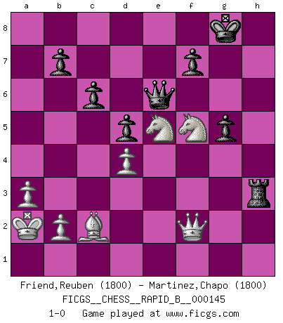 Last move : 1-0 2010 June 14 18:28:55 [Event "FICGS__CHESS__RAPID_B__000145"] [Site "FICGS"] [Date "2010.03.05"] [Round "1"] [White "Friend,Reuben"] [Black "Martinez,Chapo"] [Result "1-0"] [WhiteElo "1800"] [BlackElo "1800"] 1.d4 Nf6 2.c4 e6 3.Nc3 d5 4.cxd5 exd5 5.Bg5 Be7 6.e3 c6 7.Bd3 Nbd7 8.Nge2 h6 9.Bh4 Nh5 10.Bxe7 Qxe7 11.Qc2 O-O 12.g4 Nhf6 13.Rg1 Nb6 14.g5 Ng4 15.gxh6 Qh4 16.O-O-O Qxh6 17.Nf4 Re8 18.Rg3 Qxh2 19.Rg2 Qh6 20.Rdg1 Nc4 21.Rxg4 Bxg4 22.Rxg4 Rxe3 23.fxe3 Nxe3 24.Qe2 Nxg4 25.Qxg4 Qf6 26.Nh5 Qh6+ 27.Kc2 g6 28.Nf6+ Kg7 29.Nd7 Rh8 30.Qf3 Qh4 31.Qe3 Qh2+ 32.Ne2 Qd6 33.Ne5 Qe7 34.Qg3 Qh4 35.Qg2 Rh6 36.a3 Qh3 37.Qf2 Qe6 38.Nf4 Qe7 39.Qg3 Qh4 40.Qf3 Qe7 41.Kb3 a6 42.Ka2 a5 43.Bc2 a4 44.Qf2 Qe8 45.Bxa4 g5 46.Ne2 Qe6 47.Ng3 Kg8 48.Nf5 Rh3 49.Bc2 1-0 Queen's pawn game Kingside Castling by player Black (move 11) Queenside Castling by player White (move 16) Player White won this chess game. Follow this game move after move (download)After a bad opening, there is hope for the middle game. After a bad middle game, there is hope for the endgame. But once you are in the endgame, the moment of truth has arrived. (Edmar Mednis) Der Traum, für den ich lebe, ist der von einem freien Russland. Viele mögen sagen: Russland hat doch ein Parlament, einen gewählten Präsidenten. Aber ich spüre, dass in meiner Heimat die Angst wiederkehrt. Eine Angst, sich frei zu äußern, bestimmte Dinge zu tun (Garry Kasparov) Sin errores no puede haber brillantez. (Emanuel Lasker) Les Echecs mettent en conflit, non pas deux intelligences, mais deux volontés. (Lasker) Memory is a complicated thing, a relative to truth, but not its twin. (Barbara Kingsolver, Animal Dreams)