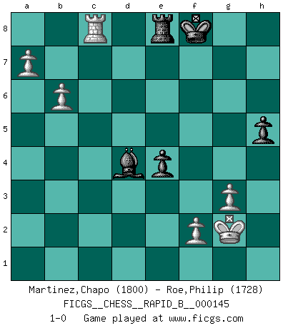 Last move : 1-0 2010 April 12 14:33:15 [Event "FICGS__CHESS__RAPID_B__000145"] [Site "FICGS"] [Date "2010.03.05"] [Round "1"] [White "Martinez,Chapo"] [Black "Roe,Philip"] [Result "1-0"] [WhiteElo "1800"] [BlackElo "1728"] 1.d4 Nf6 2.c4 Nc6 3.Nf3 e6 4.a3 d6 5.Nc3 g6 6.g3 Bg7 7.Bg2 O-O 8.O-O e5 9.d5 Ne7 10.e4 Nh5 11.Re1 f5 12.exf5 Bxf5 13.Ng5 h6 14.Ne6 Bxe6 15.dxe6 c6 16.Qd3 Nf6 17.h4 Nf5 18.Bh3 Ne8 19.h5 Qf6 20.hxg6 Qxg6 21.Bd2 Qxe6 22.Re3 Qg6 23.Rf3 Ne7 24.Qxg6 Nxg6 25.Rd3 Ne7 26.Ne4 Nf5 27.Bxf5 Rxf5 28.Nxd6 Nxd6 29.Rxd6 e4 30.Re1 Re8 31.b4 Rf3 32.Be3 a6 33.Kg2 h5 34.Rh1 Re5 35.Bd4 Rg5 36.Be3 Re5 37.Rd8+ Rf8 38.Rhd1 b5 39.R8d6 Rc8 40.Rg6 Kf7 41.R1d6 R5e8 42.Rxc6 bxc4 43.Rxa6 c3 44.a4 c2 45.Rgc6 Kf8 46.a5 Bb2 47.b5 c1Q 48.Bxc1 Bxc1 49.Rxc8 Rxc8 50.Rc6 Rb8 51.b6 Bb2 52.a6 Bd4 53.a7 Re8 54.Rc8 1-0 Kevitz-Trajkovich defense Kingside Castling by player Black (move 7) Kingside Castling by player White (move 8) Promotion Queen by player Black (move 47) Player White won this chess game. Follow this game move after move (download)Pawns: they are the soul of this game, they alone form the attack and defense. (Philidor) Glücklicherweise sind Großmeister Ruben Fines reine Schachbücher weniger phallozentrisch [als seine Schachpsychologie] und deswegen auch weniger lächerlich. (Nigel Short) Buenas posiciones no logran ganar juegos, buenas movidas sí. (Gerald Abrahams) Dieu déplace le joueur, et celui-ci la pièce. Quel Dieu derrière Dieu commence donc la trame ? Arturo Perez-Reverte (prix de littérature policière 1993). No, I am still playing. (Anatoly Karpov)