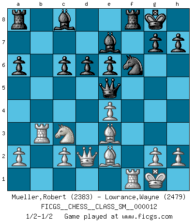 Last move : 1/2-1/2 2010 June 16 5:10:14 [Event "FICGS__CHESS__CLASS_SM__000012"] [Site "FICGS"] [Date "2010.03.07"] [Round "1"] [White "Mueller,Robert"] [Black "Lowrance,Wayne"] [Result "1/2-1/2"] [WhiteElo "2383"] [BlackElo "2479"] 1.e4 c5 2.Nf3 d6 3.d4 cxd4 4.Nxd4 Nf6 5.Nc3 a6 6.Bg5 e6 7.f4 Qb6 8.Qd2 Qxb2 9.Rb1 Qa3 10.f5 Nc6 11.fxe6 fxe6 12.Nxc6 bxc6 13.Be2 Be7 14.O-O O-O 15.Rb3 Qc5+ 16.Be3 Qe5 1/2-1/2 Sicilian : Najdorf, 7...Qb6 Kingside Castling by player White (move 14) Kingside Castling by player Black (move 14) This chess game ended in a draw. Follow this game move after move (download)Half the variations which are calculated in a tournament game turn out to be completely superfluous. Unfortunately, no one knows in advance which half. (Jan Tinman) Über Karpov: Er war und ist ein Vertreter der russischen Reaktionäre. Das steckt tief in seiner Seele, wehalb ich nicht nett mit ihm umgehen kann. (Viktor Kortschnoi) Tu sabes que vas a perder. Aún cuando tenía la ventaja, yo sabía que iba a perder. - al estar jugando con Fischer (Andrew Soltis) Pour moi, les échecs ne sont pas un jeu mais un art. (Alexandre Alekhine) He who fights with monsters should be careful lest he thereby become a monster. (Friedrich Nietzsche, Beyond Good and Evil)