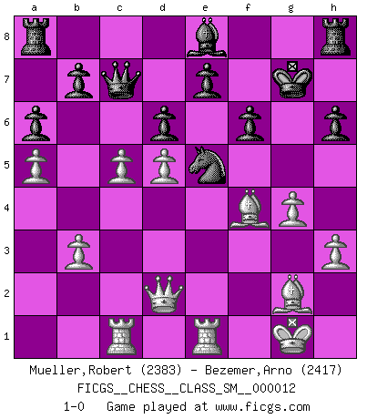 Last move : 1-0 2010 September 16 20:53:58 [Event "FICGS__CHESS__CLASS_SM__000012"] [Site "FICGS"] [Date "2010.03.07"] [Round "1"] [White "Mueller,Robert"] [Black "Bezemer,Arno"] [Result "1-0"] [WhiteElo "2383"] [BlackElo "2417"] 1.e4 Nf6 2.e5 Nd5 3.c4 Nb6 4.d4 d6 5.exd6 cxd6 6.Nc3 g6 7.Nf3 Bg7 8.h3 O-O 9.Be2 Nc6 10.O-O Bf5 11.Re1 Re8 12.Bf1 h6 13.g4 Bc8 14.a4 a6 15.a5 Nd7 16.d5 Nce5 17.Nd4 Qc7 18.b3 g5 19.Nf5 Ng6 20.Nxg7 Kxg7 21.Ne2 Nde5 22.Bg2 f6 23.f4 Nxf4 24.Nxf4 gxf4 25.Bxf4 Rh8 26.Qd2 Bd7 27.Rac1 Be8 28.c5 1-0 This chess game has been lost on time (started : 2010.03.07 21:58:9) Alekhine's defense Kingside Castling by player Black (move 8) Kingside Castling by player White (move 10) Player White won this chess game. Follow this game move after move (download)Chess is so inspiring that I do not believe a good player is capable of having an evil thought during the game. (Wilhelm Steinitz) Kombinieren und Schwarzhandel gehören verboten. (Savielly Grigorievitsch Tartakower) Una compensación adecuada por un sacrificio es tener una combinación sólida que conduce a una posición ganadora; una compensación adecuada por una metida de pata es dejar a tu oponente arrebatar una derrota de las fauces de la victoria. (Bruce A. Moon) Karpov est une pièce de musée. (Garry Kasparov) Go and wake up your luck. (Persian saying)