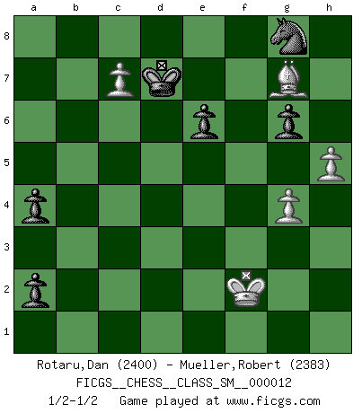 Last move : 1/2-1/2 2010 November 1 23:21:33 [Event "FICGS__CHESS__CLASS_SM__000012"] [Site "FICGS"] [Date "2010.03.07"] [Round "1"] [White "Rotaru,Dan"] [Black "Mueller,Robert"] [Result "1/2-1/2"] [WhiteElo "2400"] [BlackElo "2383"] 1.d4 Nf6 2.c4 e6 3.Nc3 Bb4 4.e3 O-O 5.Bd3 d5 6.Nf3 c5 7.O-O Nc6 8.a3 Bxc3 9.bxc3 Qc7 10.Bb2 Na5 11.cxd5 exd5 12.Nd2 Bg4 13.f3 Bh5 14.a4 Rfe8 15.Re1 Bg6 16.Bxg6 hxg6 17.Rc1 Rad8 18.e4 Nh5 19.g3 dxe4 20.Nxe4 b6 21.Rc2 Nf6 22.Rce2 Nxe4 23.fxe4 Qd7 24.e5 Nc4 25.Ba1 a6 26.Qc2 b5 27.Qa2 Qd5 28.Rc1 Re6 29.Rf2 bxa4 30.Rcf1 Ne3 31.Re1 cxd4 32.cxd4 Qc6 33.Qd2 Nf5 34.Rc1 Qd5 35.Rc5 Qb7 36.d5 Rb6 37.d6 Rb1+ 38.Rc1 Rxc1+ 39.Qxc1 Rc8 40.Rc2 Qb6+ 41.Kh1 Rxc2 42.Qxc2 a3 43.Qc1 Kh7 44.Kg2 a2 45.Qc3 a5 46.h3 a4 47.Kf1 Qb1+ 48.Ke2 Qb7 49.Kf2 Qb6+ 50.Kg2 Qb7+ 51.Kf2 Kg8 52.Qc7 Qxc7 53.dxc7 Ne7 54.h4 Kf8 55.e6 fxe6 56.g4 Ke8 57.Bxg7 Kd7 58.h5 Ng8 1/2-1/2 Nimzo-Indian : 4.e3 O-O, 5.Bd3 d5 Kingside Castling by player Black (move 4) Kingside Castling by player White (move 7) This chess game ended in a draw. Follow this game move after move (download)The game of chess is the touchstone of the intellect. (Goethe) Ein Gewinn durch eine ungenaue Kombination, sei sie auch noch so vorzeigbar, erfüllt mich mit Schaudern. (Wilhelm Steinitz) No solamente yo pronostico su triunfo sobre Botvinnik, sino que me adelanto y digo que probablemente Fischer es el jugador de Ajedrez mas grande que haya existido. (John Collins) Le jeu d'échecs fait naître et fortifie en nous plusieurs qualités précieuses dans le cours de l'existence, telles que la prévoyance, la circonspection, la prudence, et la persévérance. (Benjamin Franklin - 1783, la morale des échecs) Perhaps the current trend of many chess professionals taking up the more lucrative pastime of poker is not a wholly negative one. It may not be too late for humans to relearn how to take risks in order to innovate and thereby maintain the advanced lifestyles we enjoy. And if it takes a poker-playing supercomputer to remind us that we can't enjoy the rewards without taking the risks, so be it. (The Chess Master and the Computer, by Garry Kasparov - 2010)