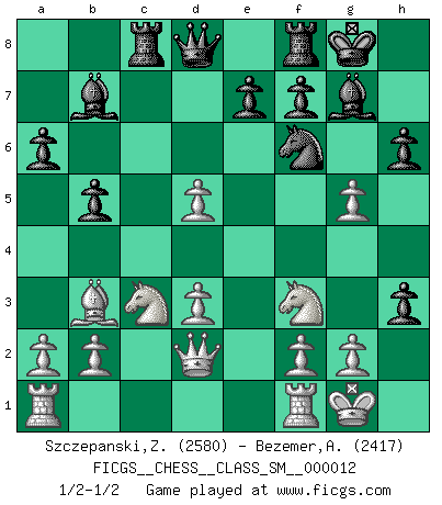 Last move : 1/2-1/2 2010 June 9 20:22:24 [Event "FICGS__CHESS__CLASS_SM__000012"] [Site "FICGS"] [Date "2010.03.07"] [Round "1"] [White "Szczepanski,Zbigniew"] [Black "Bezemer,Arno"] [Result "1/2-1/2"] [WhiteElo "2580"] [BlackElo "2417"] 1.c4 c6 2.e4 d5 3.exd5 cxd5 4.cxd5 Nf6 5.Qa4+ Nbd7 6.Nc3 g6 7.Nf3 Bg7 8.Bc4 O-O 9.d3 a6 10.Be3 Ng4 11.Qd1 b5 12.Bb3 Bb7 13.O-O Rc8 14.Qd2 Ndf6 15.Bg5 h6 16.Bh4 g5 17.h3 gxh4 18.hxg4 h3 19.g5 1/2-1/2 English : Caro-Kann defensive system Kingside Castling by player Black (move 8) Kingside Castling by player White (move 13) This chess game ended in a draw. Follow this game move after move (download)Chess is in its essence a game, in its form an art, and in its execution a science. (Baron Tassilo) Schon mancher Spieler hat aufgegeben, um zu vermeiden, daß er eine Figur verliert. (Savielly Grigorievitsch Tartakower) Sin errores no puede haber brillantez. (Emanuel Lasker) 'L'échange des dames est un coup dur pour les deux adversaires...' Un journaliste lors d'une partie du match Spassky-Fischer Follow your passion, and success will follow you. (Arthur Buddhold)