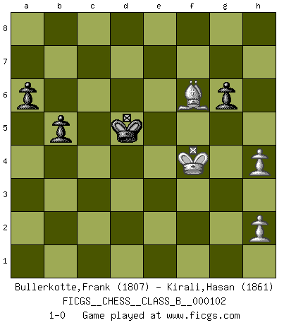Last move : 1-0 2010 September 14 20:49:49 [Event "FICGS__CHESS__CLASS_B__000102"] [Site "FICGS"] [Date "2010.03.08"] [Round "1"] [White "Bullerkotte,Frank"] [Black "Kirali,Hasan"] [Result "1-0"] [WhiteElo "1807"] [BlackElo "1861"] 1.d4 d5 2.c4 c6 3.Nf3 Nf6 4.Nc3 e6 5.Bg5 Nbd7 6.e3 Qa5 7.Nd2 Bb4 8.Qc2 O-O 9.Be2 c5 10.O-O cxd4 11.Nb3 Qb6 12.Na4 Qc7 13.Nxd4 dxc4 14.Bxc4 Bd6 15.f4 a6 16.Be2 Nd5 17.Qxc7 Bxc7 18.Rac1 N7b6 19.Rxc7 Nxa4 20.R7c1 Nxe3 21.Rf3 Nd5 22.b3 Nab6 23.a4 Re8 24.Bh4 Bd7 25.R3f1 Rac8 26.a5 Rxc1 27.Rxc1 Nc8 28.Bf3 Nd6 29.Bxd5 exd5 30.Rc7 Bc8 31.Be7 Ne4 32.Bb4 h5 33.f5 h4 34.Be7 f6 35.Kf1 Ng5 36.Bb4 Ne4 37.Be7 Kh7 38.Ba3 Rd8 39.Ne6 Bxe6 40.fxe6 Re8 41.e7 Nd2+ 42.Kf2 Nxb3 43.Rd7 Kg6 44.Rxd5 Kf7 45.Bb4 Nc1 46.Rd7 Ke6 47.Rd1 Nb3 48.Kf3 h3 49.gxh3 Kf7 50.Rd7 g6 51.Ke3 Nxa5 52.Bxa5 Rxe7+ 53.Rxe7+ Kxe7 54.Kf4 Kd6 55.h4 b5 56.Bc3 Kd5 57.Bxf6 1-0 QGD Slav : 4.Nc3 Kingside Castling by player Black (move 8) Kingside Castling by player White (move 10) 10 pieces endgame at move 53 : White KRBPP , Black KPPPP WHITE : King + 1 Rook 1 Bishop 2 Pawns BLACK : King + 4 Pawns 9 pieces endgame at move 53 : White KBPP , Black KPPPP WHITE : King + 1 Bishop 2 Pawns BLACK : King + 4 Pawns 8 pieces endgame at move 57 : White KBPP , Black KPPP WHITE : King + 1 Bishop 2 Pawns BLACK : King + 3 Pawns Player White won this chess game. Follow this game move after move (download)Robert Fischer is a law unto himself. (Larry Evans) Ich suche im Schach immer etwas Eigenes. Riskantes Spiel im Stile schachlicher Musketiere ist nicht meine Sache, auch wenn es vielen Freunden scharfer Wendungen gefällt. (Anatoly Karpov) Si yo gano un torneo, yo lo gano por mí mismo. Yo hago las jugadas. Nadie me ayuda. (Bobby Fischer) Karpov est une pièce de musée. (Garry Kasparov) Luck is when opportunity knocks and you answer. (Anonymous)