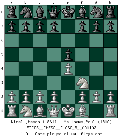 Last move : 1-0 2010 April 17 21:14:9 [Event "FICGS__CHESS__CLASS_B__000102"] [Site "FICGS"] [Date "2010.03.08"] [Round "1"] [White "Kirali,Hasan"] [Black "Matthews,Paul"] [Result "1-0"] [WhiteElo "1861"] [BlackElo "1800"] 1.e4 e5 2.Nf3 1-0 This chess game has been lost on time (started : 2010.03.08 17:3:29) King's knight Opening Player White won this chess game. Follow this game move after move (download)Whoever sees no other aim in the game than that of giving checkmate to one's opponent will never become a good Chess player. (Euwe) Wenn ich Weiß habe gewinne ich weil ich Weiß habe, wenn ich Schwarz habe gewinne ich weil ich Bogoljubov bin. (Efim Bogoljubov) Si el ingenio solamente fuese necesario para lucirse, las mujeres serían las mejores jugadoras de Ajedrez del mundo. (Albin) Echiquier : carré parfait, comme la Jérusalem nouvelle décrite par l'auteur de l'Apocalypse, huit cases sur huit, exaltation du chiffre 4, symbole du cosmos aux quatre horizons... où le noir et le blanc, l'ombre et la lumière, le mal et le bien s'entremêlent et se conjuguent. (Robert Couffignal, Le Gambit du poète) Success without honor is an unseasoned dish; it will satisfy your hunger, but it won't taste good. (Joe Paterno)