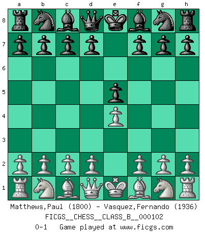 Last move : 0-1 2010 April 17 21:14:9 [Event "FICGS__CHESS__CLASS_B__000102"] [Site "FICGS"] [Date "2010.03.08"] [Round "1"] [White "Matthews,Paul"] [Black "Vasquez,Fernando"] [Result "0-1"] [WhiteElo "1800"] [BlackElo "1936"] 1.e4 e5 0-1 This chess game has been lost on time (started : 2010.03.08 17:3:29) King's pawn game Player Black won this chess game. Follow this game move after move (download)The stomach is an essential part of the Chess master. (Bent Larsen) Der 70jährige Viktor Kortschnoi: Die Rentenanstalt wollte mich zwingen in Rente zu gehen. Meine Frau erhält jetzt eine Pension- und ich zahle weiter in die Rentenkasse ein! (Viktor Kortschnoi) Tu sabes, camarada Pachman, no disfruto el ser un Ministro, preferería jugar al Ajedrez como tu. (Che Guevara) Les écrivains ont utilisé les échecs pour analyser les côtés extrêmes de la nature humaine. Dans ce cadre, les échecs offrent un champ d'expérimentation idéal. Mais on pourrait faire la même chose avec la peinture. Et là, en vous référant à Van Gogh, vous ne tirerez pas de conclusion définitive sur les peintres. (Gary Kasparov) It is not enough to be a good player... you must also play well. (Siegbert Tarrasch)
