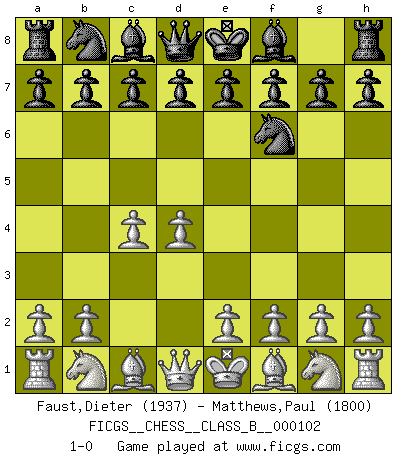 Last move : 1-0 2010 April 18 21:17:6 [Event "FICGS__CHESS__CLASS_B__000102"] [Site "FICGS"] [Date "2010.03.08"] [Round "1"] [White "Faust,Dieter"] [Black "Matthews,Paul"] [Result "1-0"] [WhiteElo "1937"] [BlackElo "1800"] 1.d4 Nf6 2.c4 1-0 This chess game has been lost on time (started : 2010.03.08 17:3:29) Queen's pawn game Player White won this chess game. Follow this game move after move (download)Fischer is an American Chess tragedy on par with Morphy and Pillsbury. (Mig Greengard) Je älter ich werde, um so mehr schätze ich die Bauern. (Paul Keres) La señal de un Gran Maestro es su habilidad de ganar una partida rápidamente y sin dolor. (Irving Chernev) Il a essayé de se convaincre qu'il pourrait empêcher toutes les erreurs et ne jamais perdre. L'horreur ! Gary Kasparov au sujet de Robert Fischer. A woman without a man is like a fish without a bicycle. (Gloria Steinem)