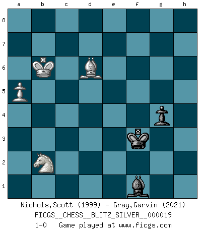 Last move : 1-0 2010 March 9 19:0:40 [Event "FICGS__CHESS__BLITZ_SILVER__000019"] [Site "FICGS"] [Date "2010.03.09"] [Round "1"] [White "Nichols,Scott"] [Black "Gray,Garvin"] [Result "1-0"] [WhiteElo "1999"] [BlackElo "2021"] 1.e4 e6 2.d4 d5 3.Nc3 Bb4 4.e5 c5 5.a3 Bxc3+ 6.bxc3 Ne7 7.Qg4 Qc7 8.Qxg7 Rg8 9.Qxh7 cxd4 10.Ne2 Nbc6 11.f4 Bd7 12.Qd3 dxc3 13.Qxc3 O-O-O 14.h4 Rg4 15.h5 Nf5 16.Rb1 Rdg8 17.Rh3 Kb8 18.Kf2 Qd8 19.g3 R4g7 20.Bd2 Ka8 21.Bg2 Nce7 22.Bf3 Bc6 23.Qb4 b6 24.h6 Rh7 25.Rbh1 Rgh8 26.g4 Rxh6 27.Rxh6 Nxh6 28.Kg2 Ng6 29.Qd6 Qc8 30.Nd4 Bb7 31.f5 exf5 32.Rxh6 Rxh6 33.Bxh6 Nh4+ 34.Kg3 Nxf3 35.Kxf3 fxg4+ 36.Kg2 Qc5 37.Qxc5 bxc5 38.e6 fxe6 39.Nxe6 d4 40.Kg3 Bf3 41.Nxc5 Bd1 42.Bf4 a5 43.Ne6 Bxc2 44.Nxd4 Bd1 45.Bc7 a4 46.Nb5 Kb7 47.Be5 Kb6 48.Nc3 Bf3 49.Nxa4+ Kb5 50.Nb2 Be2 51.Kf2 Bf3 52.Ke3 Bc6 53.Kd4 Kb6 54.Nc4+ Kb5 55.Bd6 Bf3 56.Nb2 Kb6 57.Kc4 Be2+ 58.Kb4 Kc6 59.Bg3 Kd5 60.a4 Ba6 61.Ka5 Bf1 62.Kb6 Ke4 63.a5 Kf3 64.Bd6 1-0 French : Winawer, Advance, poisoned pawn variation Queenside Castling by player Black (move 13) 10 pieces endgame at move 41 : White KBNPP , Black KBPPP WHITE : King + 1 Bishop 1 Knight 2 Pawns BLACK : King + 1 Bishop 3 Pawns 9 pieces endgame at move 43 : White KBNP , Black KBPPP WHITE : King + 1 Bishop 1 Knight 1 Pawn BLACK : King + 1 Bishop 3 Pawns 8 pieces endgame at move 44 : White KBNP , Black KBPP WHITE : King + 1 Bishop 1 Knight 1 Pawn BLACK : King + 1 Bishop 2 Pawns 7 pieces endgame at move 49 : White KBNP , Black KBP WHITE : King + 1 Bishop 1 Knight 1 Pawn BLACK : King + 1 Bishop 1 Pawn Player White won this chess game. Follow this game move after move (download)The isolated Pawn casts gloom over the entire chessboard. (Aaron Nimzovich) Ich hatte Angst gegen einen russischen Großmeister zu verlieren, und er befürchtete gegen einen kleinen Jungen zu verlieren. (über ein Remis gegen Juri Awerbach). (Robert James Fischer) El Ajedrez es realmente noventa y nueve por ciento calculación. (Soltis) Des combinaisons [dans le jeu d'échecs] pareilles à des mélodies. Je crois entendre pour ainsi dire la musique des coups... (Vladimir Nabokov) Waiting for chance ? Play in casinos. (FICGS proverb)