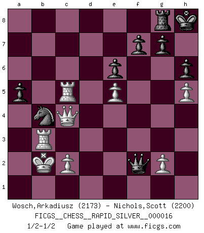 Last move : 1/2-1/2 2010 May 30 2:57:37 [Event "FICGS__CHESS__RAPID_SILVER__000016"] [Site "FICGS"] [Date "2010.03.12"] [Round "1"] [White "Wosch,Arkadiusz"] [Black "Nichols,Scott"] [Result "1/2-1/2"] [WhiteElo "2173"] [BlackElo "2200"] 1.e4 d5 2.exd5 Qxd5 3.Nc3 Qa5 4.d4 Nf6 5.Nf3 c6 6.Bc4 Bf5 7.Bd2 e6 8.Qe2 Bb4 9.O-O-O Nbd7 10.a3 Bxc3 11.Bxc3 Qc7 12.Ne5 b5 13.Bb3 Be4 14.Bd2 Bd5 15.Bxd5 Nxd5 16.h4 Nxe5 17.dxe5 O-O 18.Rh3 a5 19.Rg3 Kh8 20.Be3 Qe7 21.Rd4 b4 22.Rc4 bxa3 23.Bc5 axb2+ 24.Kb1 Qc7 25.Bd6 Qb6 26.Rb3 Qa6 27.Bxf8 Rxf8 28.Qg4 c5 29.Kxb2 h6 30.h5 Rg8 31.Ka1 Nb4 32.Rxc5 Qf1+ 33.Kb2 Qxf2 34.Qc4 1/2-1/2 Scandinavian (centre counter) defense Queenside Castling by player White (move 9) Kingside Castling by player Black (move 17) This chess game ended in a draw. Follow this game move after move (download)A passed Pawn increases in strength as the number of pieces on the board diminishes. (Capablanca) Kasparov ist eine Art Monster mit hundert Augen, denen auch nicht das Geringste entgeht. (Tony Miles) Una buena memoria, concentración, imaginación y una fuerte voluntad, se requiere para llegar a ser un buen jugador. (Bobby Fischer) Roi des jeux et jeu des rois, les échecs portent en eux un sentiment d'infini. Ils donnent à celui qui s'est efforcé d'en approfondir les arcanes l'impression de n'être pas à la mesure de l'homme; en fait, ils constituent un résumé de l'univers, un microcosme, et figurent cette grande échelle qui, dans les plans de la lumière descend jusqu'à la matière, qui des abîmes insondables remonte jusqu'en l'infini de Dieu. (Pyrame) Somewhere in the world there is an epigram for every dilemma. (Hendrik Willem van Loon)
