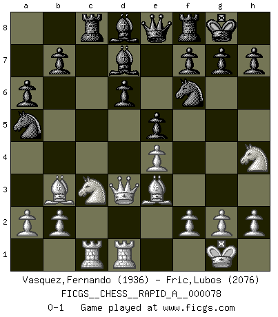 Last move : 0-1 2010 May 10 19:51:3 [Event "FICGS__CHESS__RAPID_A__000078"] [Site "FICGS"] [Date "2010.03.12"] [Round "1"] [White "Vasquez,Fernando"] [Black "Fric,Lubos"] [Result "0-1"] [WhiteElo "1936"] [BlackElo "2076"] 1.e4 c5 2.d4 cxd4 3.c3 dxc3 4.Nxc3 Nc6 5.Nf3 d6 6.Bc4 a6 7.O-O Nf6 8.Bf4 e6 9.Qe2 Nh5 10.Be3 Be7 11.Bb3 Nf6 12.Rfd1 Bd7 13.Na4 O-O 14.Bb6 Qb8 15.Rac1 Qe8 16.Nc3 Rc8 17.Nh4 e5 18.Qd3 Bd8 19.Be3 Na5 0-1 This chess game has been lost on time (started : 2010.03.12 10:3:36) Sicilian : Smith-Morra gambit Kingside Castling by player White (move 7) Kingside Castling by player Black (move 13) Player Black won this chess game. Follow this game move after move (download)The hardest game to win is a won game. (Emanuel Lasker) Warum muß ich gegen diesen IDIOTEN verlieren? (Aaron Nimzowitsch) El Ajedrez moderno está demasiado preocupado con cosas como la estructura de Peones. Olvidenlo, el Jaque Mate termina la partida. (Nigel Short) Que feriez-vous si vous étiez en train de jouer aux échecs et que la fin du monde arrive ? Je continuerais à jouer. (Saint Borromée) Do not put your faith in what statistics say until you have carefully considered what they do not say. (William W. Watt)