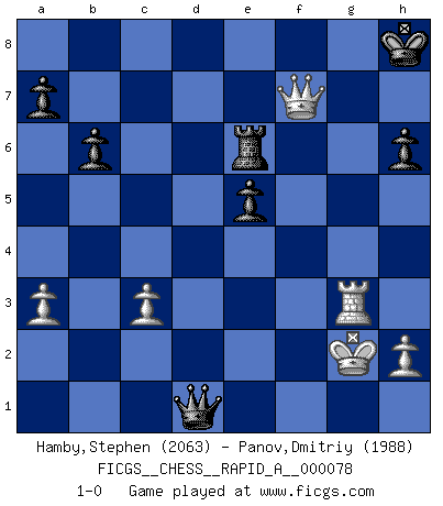 Last move : 1-0 2010 June 2 23:46:38 [Event "FICGS__CHESS__RAPID_A__000078"] [Site "FICGS"] [Date "2010.03.12"] [Round "1"] [White "Hamby,Stephen"] [Black "Panov,Dmitriy"] [Result "1-0"] [WhiteElo "2063"] [BlackElo "1988"] 1.c4 Nf6 2.d4 e6 3.Nc3 Bb4 4.f3 d5 5.a3 Bxc3+ 6.bxc3 b6 7.Bg5 h6 8.Bh4 O-O 9.Nh3 Re8 10.Nf2 Nbd7 11.e4 dxe4 12.fxe4 e5 13.Bd3 Qe7 14.O-O Qd6 15.Qf3 Bb7 16.d5 Qc5 17.Kh1 Qf8 18.c5 Qxc5 19.Ng4 Qd6 20.Bb5 c6 21.Nxf6+ Nxf6 22.Bxf6 gxf6 23.Qg4+ Kh8 24.Qh3 Kg7 25.Qg4+ Kh7 26.Qh4 Kg7 27.Rf3 cxd5 28.Bxe8 Rxe8 29.Raf1 Re6 30.Rg3+ Kh7 31.exd5 Bxd5 32.Rd1 f5 33.Qh3 Bxg2+ 34.Kxg2 Qxd1 35.Qxf5+ Kh8 36.Qxf7 1-0 English, 1...Nf6 (Anglo-Indian defense) Kingside Castling by player Black (move 8) Kingside Castling by player White (move 14) Player White won this chess game. Follow this game move after move (download)Personally, I rather look forward to a computer program winning the world Chess Championship. Humanity needs a lesson in humility. (Richard Dawkings) Ich würde mich als ganz normalen Jungen bezeichnen [Im Alter von 12]. (Sergej Karjakin) Alguna parte de un error es siempre correcto. (Savielly Tartakover) Les Echecs ont trois composantes : le temps, l'espace et le matériel en dernier. (Mikhail Tal) Remember : Your focus determines your reality. (Qui-Gon Jinn in Star Wars ep.1)