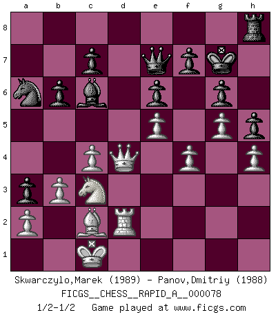 Last move : 1/2-1/2 2010 April 6 14:6:37 [Event "FICGS__CHESS__RAPID_A__000078"] [Site "FICGS"] [Date "2010.03.12"] [Round "1"] [White "Skwarczylo,Marek"] [Black "Panov,Dmitriy"] [Result "1/2-1/2"] [WhiteElo "1989"] [BlackElo "1988"] 1.d4 Nf6 2.Nf3 e6 3.c4 Bb4+ 4.Bd2 Bxd2+ 5.Qxd2 O-O 6.Nc3 d6 7.e4 Nc6 8.O-O-O Qe7 9.e5 dxe5 10.Nxe5 Nxe5 11.dxe5 Nd7 12.Qe3 b6 13.Bd3 Bb7 14.Bc2 Rfd8 15.Rd4 g6 16.Rhd1 Nc5 17.g3 Rxd4 18.Qxd4 a5 19.f4 a4 20.Rd2 a3 21.b3 Bc6 22.h3 Kg7 23.g4 Re8 24.g5 Rh8 25.h4 h5 26.Qe3 Na6 27.Qd4 1/2-1/2 Queen's pawn game Kingside Castling by player Black (move 5) Queenside Castling by player White (move 8) This chess game ended in a draw. Follow this game move after move (download)Chess is a cold bath for the mind. (Sir John Simon) Rubinstein ist ein Turmendspiel, welches die Götter vor tausenden von Jahren begannen. (Savielly Grigorievitsch Tartakower) Cuando veas una buena jugada, trata de encontrar otra mejor. (Emanuel Lasker) Il vaut toujours mieux jouer un plan faux de façon logique que de n'avoir pas de plan du tout. (Victor Kortchnoï) Those parts of the system that you can hit with a hammer (not advised) are called hardware; those program instructions that you can only curse at are called software. (Anonymous)