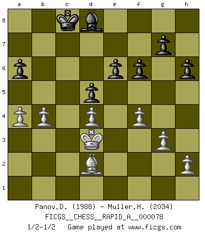 Last move : 1/2-1/2 2010 April 14 16:15:31 [Event "FICGS__CHESS__RAPID_A__000078"] [Site "FICGS"] [Date "2010.03.12"] [Round "1"] [White "Panov,Dmitriy"] [Black "Muller,Henri-Louis"] [Result "1/2-1/2"] [WhiteElo "1988"] [BlackElo "2034"] 1.e4 c5 2.c3 Nf6 3.e5 Nd5 4.d4 cxd4 5.cxd4 d6 6.Nf3 Nc6 7.Bc4 Nb6 8.Bb5 dxe5 9.Nxe5 Bd7 10.Nxd7 Qxd7 11.O-O e6 12.Nc3 Be7 13.Qf3 O-O 14.Rd1 Rfd8 15.Be3 a6 16.Bxc6 Qxc6 17.Qxc6 bxc6 18.Rac1 Rac8 19.g3 h6 20.Kg2 Nd5 21.Nxd5 cxd5 22.Bf4 Bb4 23.Kf3 Ba5 24.Ke2 f6 25.Kd3 Kf7 26.a3 Ke7 27.b4 Bb6 28.Be3 Kd7 29.Re1 Rxc1 30.Rxc1 Rc8 31.Rxc8 Kxc8 32.a4 Bc7 33.Bd2 Bd8 34.f4 1/2-1/2 Sicilian : Alapin's variation (2.c3) Kingside Castling by player White (move 11) Kingside Castling by player Black (move 13) This chess game ended in a draw. Follow this game move after move (download)Chess is a more highly symbolic game, but the aggressions are therefore even more frankly represented in the play. It probably began as a war game; that is, the representation of a miniature battle between the forces of two kingdoms. (Karl Meninger) Frage: Was machen Sie mit den Preisen? Anwort: Ich habe Angst, dass meine Freundin davon neue Kleider kauft. (Loek van Wely) Debió haber existido una vez en que los hombres eran semidióses, de otra manera no hubiesen podido inventar el Ajedrez. (Gustav Schenk) Je fais ceci parce que dans cinquante coups j'obtiendrai cela; je m'appelle Mikhail Moisevitch Botvinnik. (Botvinnik) Knowledge will give you power, but character respect. (Bruce Lee)