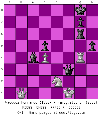 Last move : 0-1 2010 August 18 19:12:47 [Event "FICGS__CHESS__RAPID_A__000078"] [Site "FICGS"] [Date "2010.03.12"] [Round "1"] [White "Vasquez,Fernando"] [Black "Hamby,Stephen"] [Result "0-1"] [WhiteElo "1936"] [BlackElo "2063"] 1.e4 e6 2.d4 d5 3.e5 c5 4.c3 Nc6 5.Nf3 Qb6 6.Bd3 cxd4 7.cxd4 Bd7 8.Bc2 Nb4 9.O-O Nxc2 10.Qxc2 Rc8 11.Nc3 Ne7 12.Bf4 Nf5 13.Qd2 Bb4 14.Rfc1 O-O 15.g4 Ne7 16.h4 Nc6 17.a3 Be7 18.b4 f6 19.exf6 Bxf6 20.Ne2 Rce8 21.Be3 a6 22.Rab1 Be7 23.Ng5 h6 24.Nh3 Qd8 25.Nhf4 Bxh4 26.Ng6 Rf3 27.Kg2 e5 28.Rxc6 Bxc6 29.Nxe5 Rxe5 30.Kxf3 Re4 31.Rg1 Bd7 32.Kg2 Qe8 33.Kf1 Bb5 34.Rg2 Bg5 35.Rg3 Bf4 36.Rf3 Bd6 37.Ke1 Bc4 38.Ng3 Rxg4 39.Qc3 h5 40.Qc2 a5 41.bxa5 Bxa3 42.Ne2 Bb4+ 43.Kf1 Rg6 44.Qb1 Bxa5 45.Qc2 b5 46.Qb1 b4 47.Rf4 b3 48.Rh4 Qe6 49.Qb2 Qf5 50.Bd2 Bxd2 51.Qxd2 Qb1+ 52.Qe1 Qd3 53.f3 b2 54.Rg4 b1Q 55.Qxb1 Qxf3+ 0-1 French : Advance, Milner-Barry gambit Kingside Castling by player White (move 9) Kingside Castling by player Black (move 14) Promotion Queen by player Black (move 54) Player Black won this chess game. Follow this game move after move (download)Spassky will not be psyched out by Fischer. (Mike Goodall) Wenn ich Weiß habe gewinne ich weil ich Weiß habe, wenn ich Schwarz habe gewinne ich weil ich Bogoljubov bin. (Efim Bogoljubov) El Ajedrez es una guerra en un tablero. El objetivo es aplastar la mente del oponente. (Bobby Fischer) Les échecs, c'est l'imagination. (David Bronstein) Optimism is a variety of information deficit. Sometimes especially true for correspondence chess games. (Michael Aigner)