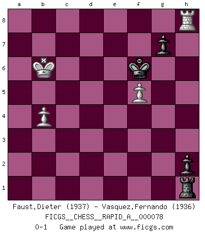 Last move : 0-1 2010 June 24 15:9:41 [Event "FICGS__CHESS__RAPID_A__000078"] [Site "FICGS"] [Date "2010.03.12"] [Round "1"] [White "Faust,Dieter"] [Black "Vasquez,Fernando"] [Result "0-1"] [WhiteElo "1937"] [BlackElo "1936"] 1.d4 d5 2.c4 dxc4 3.e4 e5 4.dxe5 Qxd1+ 5.Kxd1 Nc6 6.Bxc4 Nxe5 7.Bb3 Bc5 8.Kc2 Bxf2 9.Nc3 Ne7 10.Nf3 Nxf3 11.gxf3 Be6 12.Rd1 Nc6 13.Ba4 O-O 14.Bxc6 bxc6 15.Bf4 Bb6 16.Na4 f5 17.Nxb6 cxb6 18.Bd6 Rf6 19.Rd2 fxe4 20.fxe4 c5 21.a4 Rd8 22.a5 Bf5 23.exf5 R8xd6 24.Rxd6 Rxd6 25.axb6 axb6 26.Kc3 Rh6 27.Ra8+ Kf7 28.Rb8 Rh3+ 29.Kc4 Rxh2 30.Rxb6 h5 31.Kxc5 h4 32.b4 h3 33.Rb8 Rh1 34.Rh8 h2 35.Kb6 Kf6 0-1 QGA : 3.e4 Kingside Castling by player Black (move 13) 10 pieces endgame at move 29 : White KRPP , Black KRPPPP WHITE : King + 1 Rook 2 Pawns BLACK : King + 1 Rook 4 Pawns 9 pieces endgame at move 30 : White KRPP , Black KRPPP WHITE : King + 1 Rook 2 Pawns BLACK : King + 1 Rook 3 Pawns 8 pieces endgame at move 31 : White KRPP , Black KRPP WHITE : King + 1 Rook 2 Pawns BLACK : King + 1 Rook 2 Pawns Player Black won this chess game. Follow this game move after move (download)Good positions don't win games, good moves do. (Gerald Abrahams) Modernes Schach erfordert enorme Anspannung. Es ist für einen normalen Menschen unmöglich das auszuhalten. (Viktor Kortschnoi) El Ajedrez es la vida. (Bobby Fischer) Je crois qu'il existe des manières très spécifiques de jouer efficacement contre une machine. Evidemment, nous n'avons aucune chance en technique pure, parce que l'ordinateur calcule de manière parfaite. Mais lorsque nous faisons appel à notre cerveau, en utilisant l'intuition et la compréhension, alors nous restons beaucoup plus forts. (Anatoli Karpov) My poor ole parrot... Is not in the circulation of displays ....poo hoo hoo :) (Wayne Lowrance's enigma)